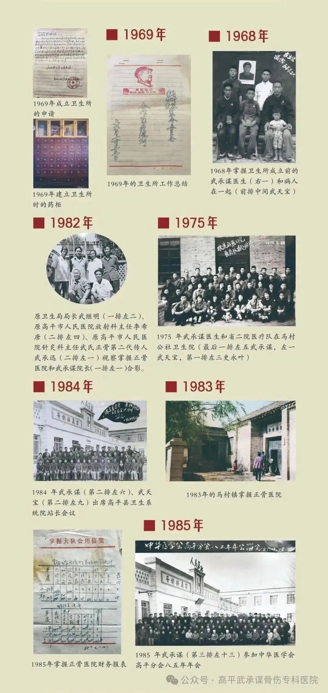 1957年,武根定去世,他的儿子武承谋继承祖传技艺,开启了武氏正骨的新发展阶段。1969年6月,武承谋在马村镇掌握村创立了“马村镇掌握村卫生所骨科”,开始了武氏正骨从乡村游医向固定诊疗的转变。1993年3月更名为“高平市武氏正骨医院”;1994年7月,第三代传人武天宝在高平市内开设“高平市武氏正骨医院友谊街分院”;2000年12月,医院更名为“高平市武承谋骨伤专科医院”。