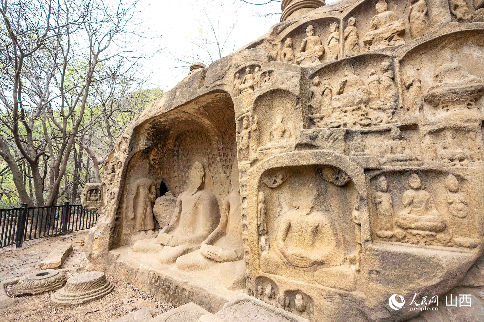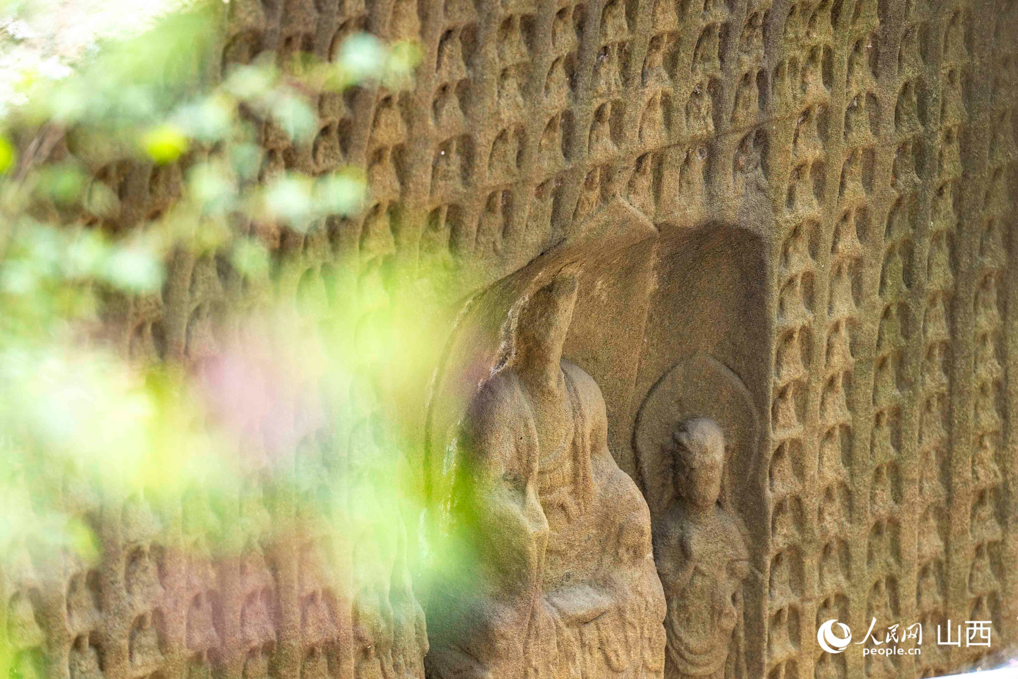 拾级而上,半山腰的“神农庙”西侧深隐着一线石磴小径,蜿蜒曲折,把游客引上深山。松柏苍翠、绿树掩映中不时有巨石出现,上面凿洞雕像,40余洞佛窟石刻,造型独特,巍巍壮观,这就是著名的国保——“羊头山石窟群”。体态端庄,典雅高贵的佛像为北魏孝文皇帝从大同迁都到洛阳后的杰作。实为雕刻艺术品中的瑰宝、如珍珠般散落在山间。