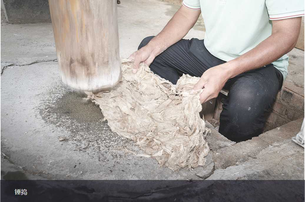 纸料制作阶段,分丝处理后的丝制原材料需木锤石臼反复击打,再经过剪切、揉合、清洗、脱色等工序制成干净的纸料。这一过程被称为“千挑万选、千锤百炼”。