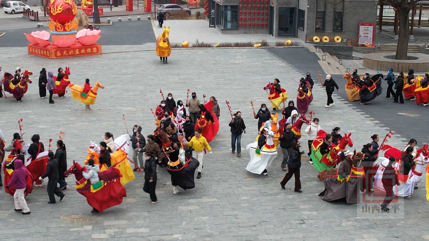 “拽着马鬃抖起来!”“步子颠起来,把马儿的欢腾劲演出来……”在北庄村社火广场,百余名村民身挎竹马,和着节拍进退穿插、变换阵型……大家时而疾驰奔腾,时而悠然漫步,将骏马驰骋的灵动姿态演绎得热闹欢腾。