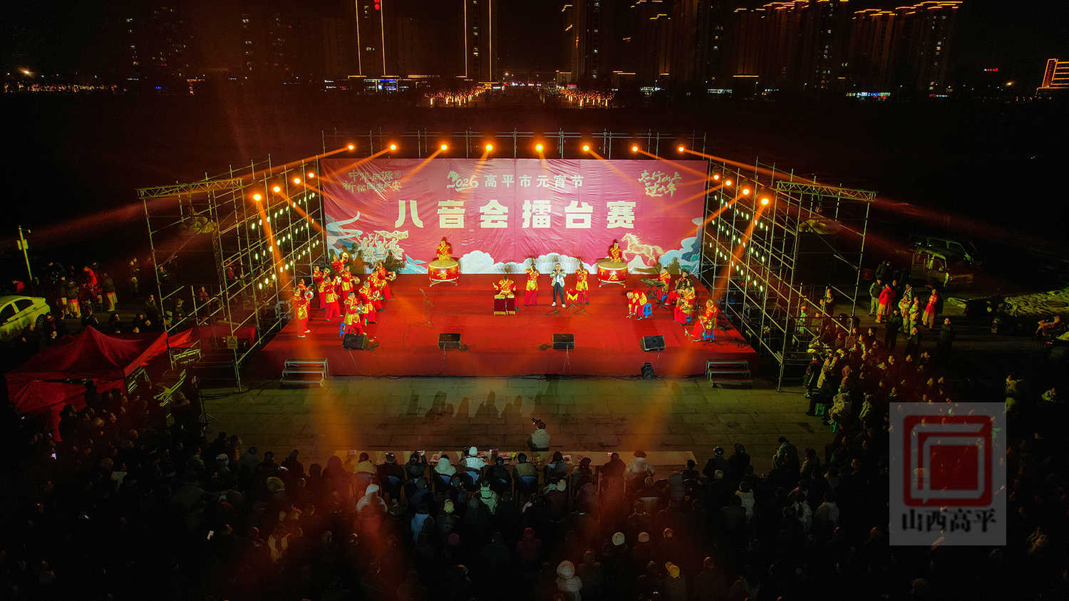 晚上8点,炎帝文化苑华灯闪烁、流光溢彩,鼓乐齐鸣、热闹非凡。参演队伍身着盛装,精神抖擞,吹拉弹奏各展绝活,依次献上《万花灯》《八音润寺庄・欢歌庆新春》《大德胜》《富硒福地闹元宵》《欢天喜地闹新春》等八音会演奏。锣鼓铙钹、上下翻飞,唢呐笙箫婉转悠扬、余韵绵长,精湛娴熟的演奏,尽显民间艺人深厚功底与八音会独特艺术魅力。