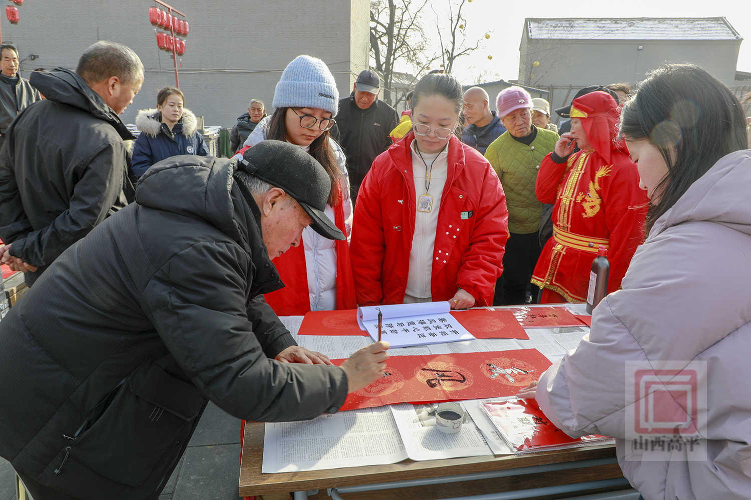 活动现场还同步开展了义写春联、发放腊八粥活动。书法家们挥毫泼墨,将新春祝福融入一副副春联中。工作人员将热气腾腾的腊八粥送到村民手中,暖胃更暖心。村民们领到手写的春联,喝着腊八粥,感受到了浓浓的年味。