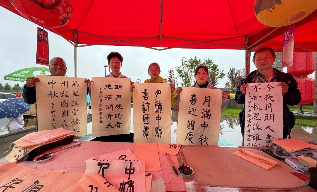 小吃游乐集市沿苏庄古街铺开,农产品、非遗文创、地道小吃琳琅满目,吆喝与笑语交织成鲜活乐章。灯谜区灯笼高悬,字谜、习俗谜引众人驻足沉思、结伴探讨。“诵秋咏月,诗到饼来”摊位前,诗词里的国庆中秋情思正浓,接过那枚月饼,甜意顺着掌心,轻轻漫遍心间。“秋墨韵同挥轩”内,宣纸铺展、墨香袅袅,书法爱好者挥毫写下“但愿人长久”“海上生明月”等诗句,市民临摹互动间,书法雅趣融入烟火气。