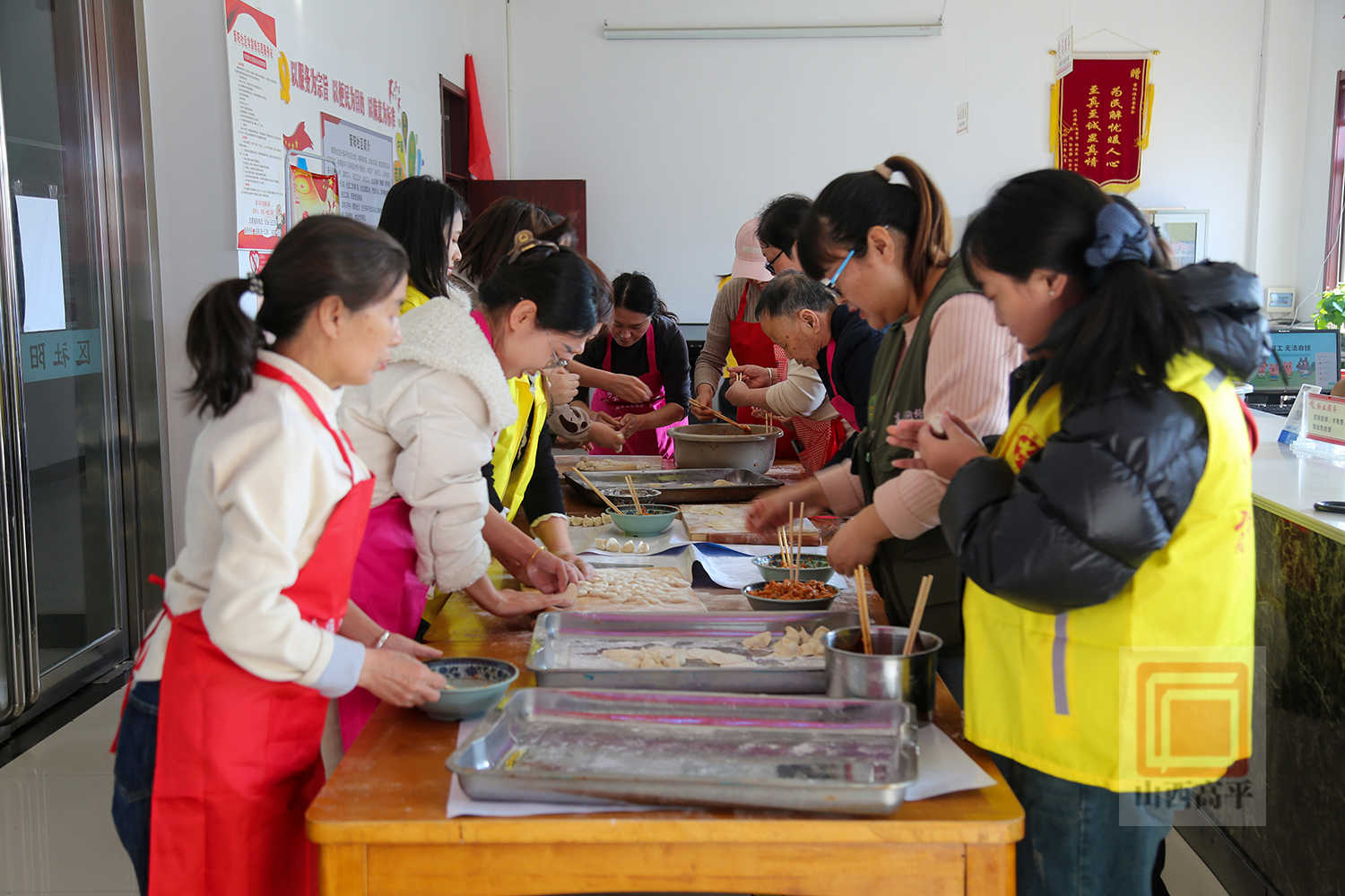 在晋阳社区党群服务站里,一派热闹。社区工作人员、志愿者和居民们分工明确,拌馅、和面、擀皮、包饺子,忙得不亦乐乎。欢声笑语间,一个个元宝形、麦穗形等形态各异的饺子摆满了托盘。