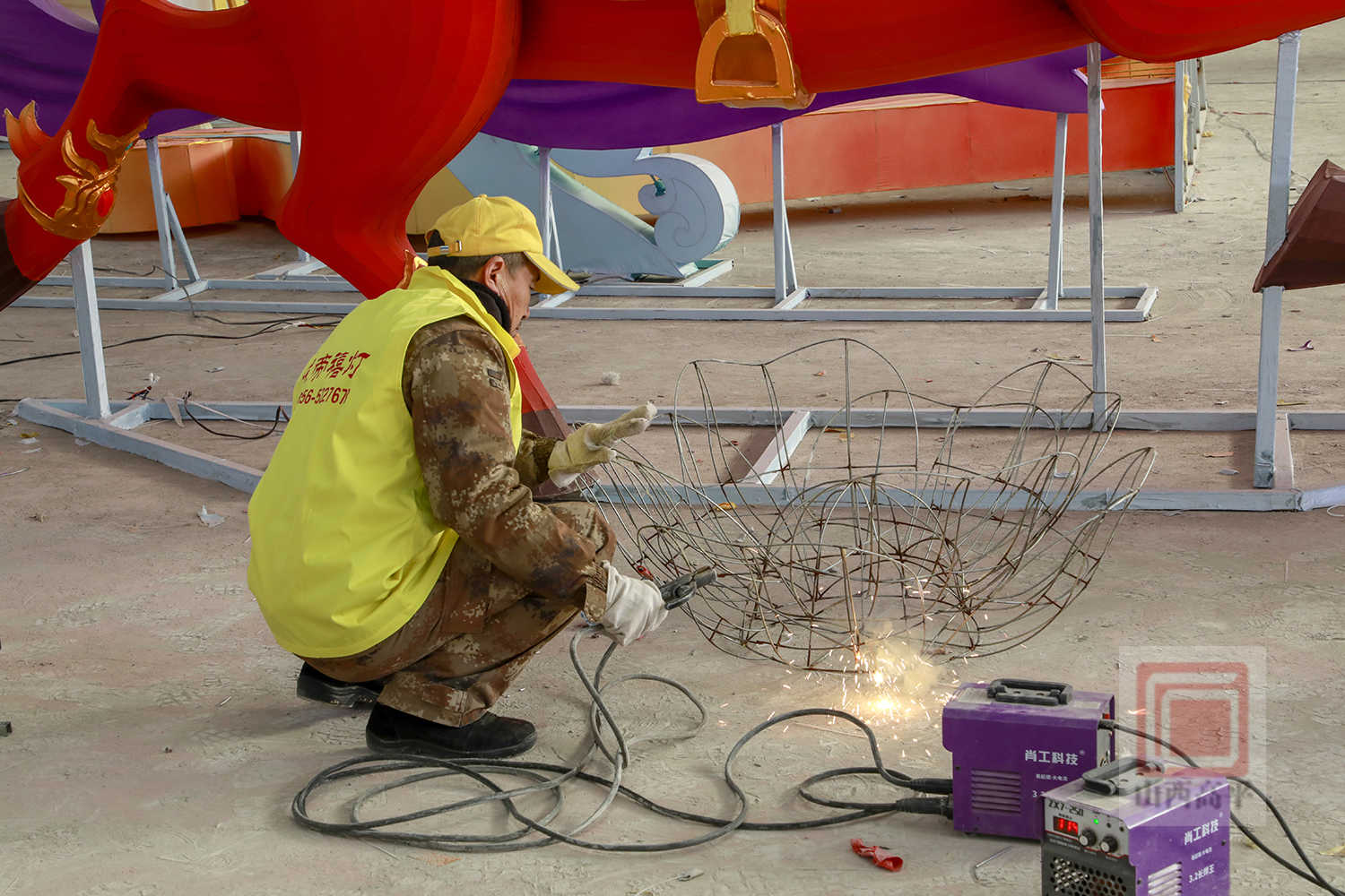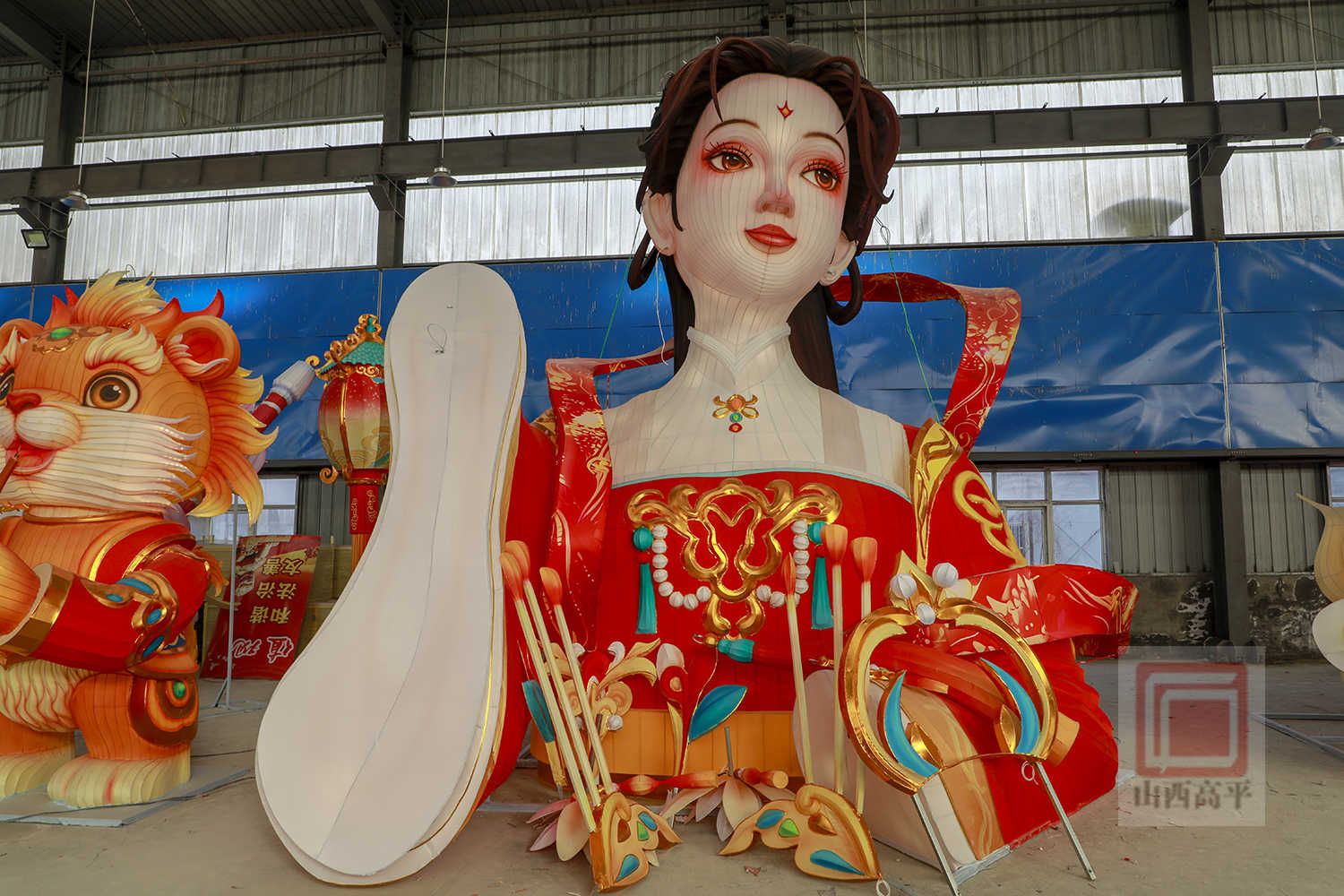 在制作环节,工人们动作娴熟地切割铁丝、焊接骨架、安装灯组、裱糊绸布,用巧手塑造着一盏盏花灯。今年该公司在推出马年主题花灯的基础上,还设计了兼具观赏性与文化性的高平非遗元素灯组。匠心设计的“八音吉乐”灯组,融入了高平八音会,造型各异的神兽分别手持唢呐、笙、锣、镲等传统乐器,以彩灯为载体,加装机械传动装置,灵动复刻了高平八音会的非遗技艺。