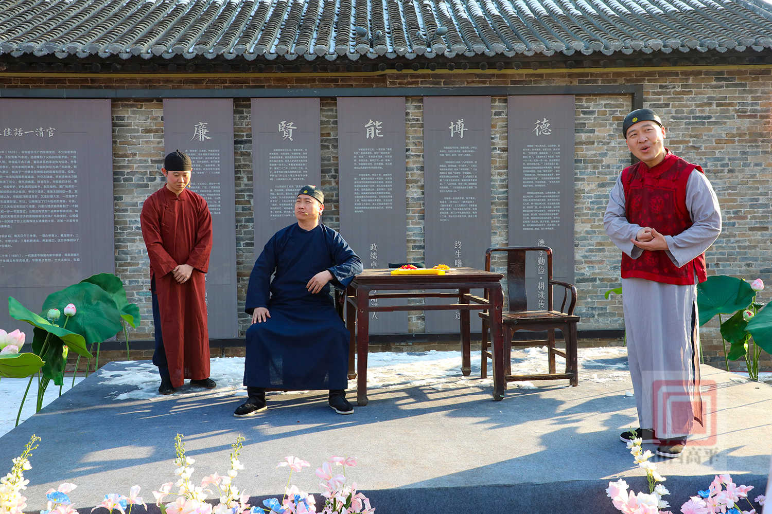 在伯方古村,锣鼓声、欢呼声、喝彩声交织,处处一片节日的喜乐祥和。来到仙翁庙广场,工作人员身着传统礼服,以古礼迎客,喜迎八方宾朋。在文庙,工作人员化身“先生”,讲解孔孟之道、传统礼仪,带领现场游客沉浸式感受中华传统文化的博大精深。其间,情景舞蹈《梦幻仙境》、情景剧《礼遇伯方》精彩上演,游客们漫步古村,在喜庆的氛围中,欢度新春。情景剧《礼遇伯方》生动还原了一代廉吏毕振姬的生平事迹,让游客在观赏表演的同时,接受廉政文化的熏陶。