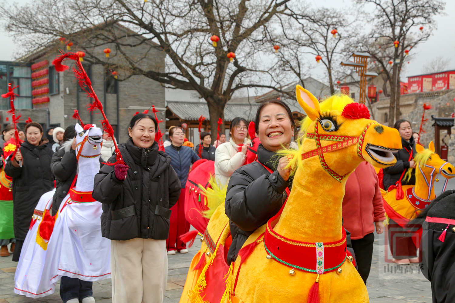 “拽着马鬃抖起来!”“步子颠起来,把马儿的欢腾劲演出来……”在北庄村社火广场,百余名村民身挎竹马,和着节拍进退穿插、变换阵型……大家时而疾驰奔腾,时而悠然漫步,将骏马驰骋的灵动姿态演绎得热闹欢腾。
