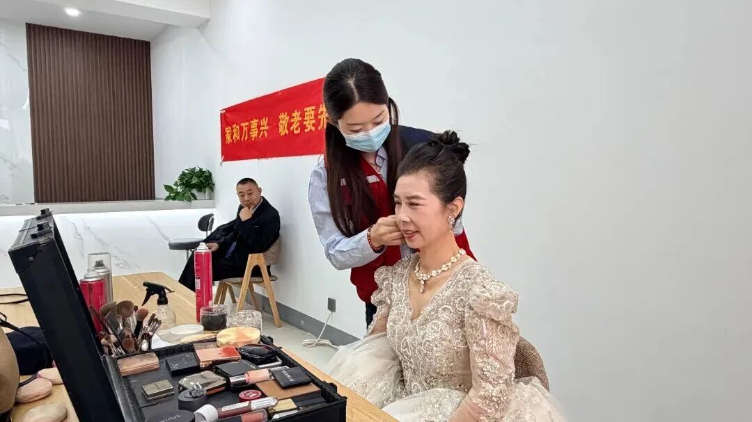 活动当天,精卫社区党群服务中心被精心布置成温馨的摄影棚。在专业化妆师、造型师的打理下,老人们身着婚纱礼服,精神焕发。在摄影师的引导下、子女的陪伴下,他们从羞涩拘谨变得从容自然,相互搀扶、深情对视,每一个瞬间都饱含着岁月沉淀的爱意。快门声此起彼伏,定格下这份相濡以沫的美好。