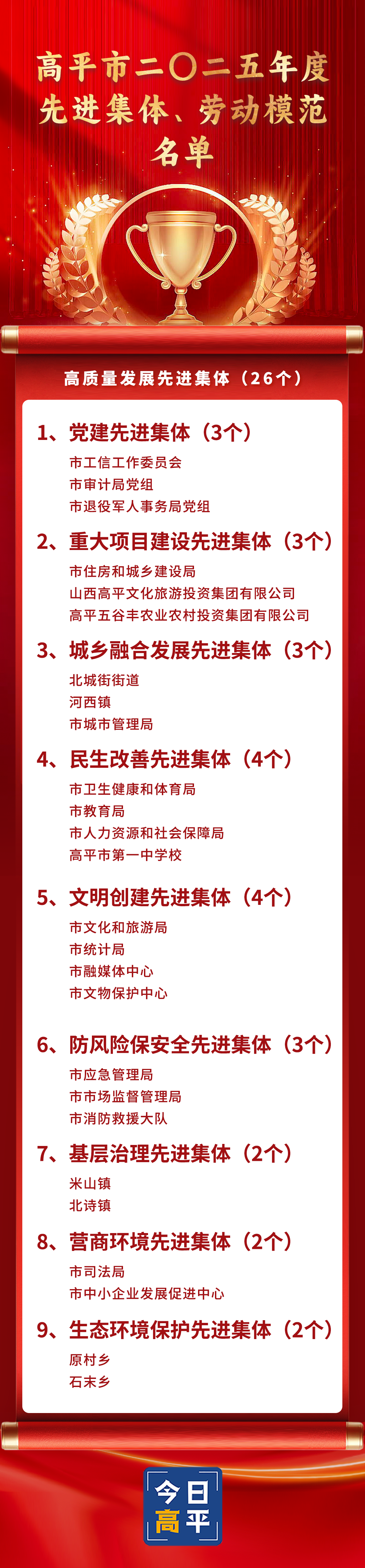 向劳模致敬 与榜样同行!高平市2025年度先进集体、劳动模范名单出炉! 来源:高平市融媒体中心 发布时间:2026-03-05 【字体:小 大】 3月5日上午市委农村工作会议暨2025年度劳模表彰大会在市委党校召开会上对我市各行各业涌现出的先进集体和先进个人进行表彰学习标杆 争当先进一起来看高平市2025年度先进集体、劳动模范名单 本页二维码 【打印正文】