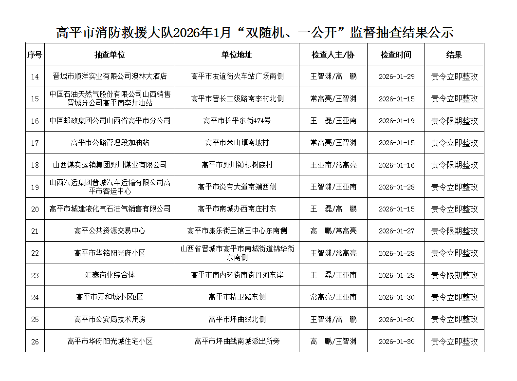 根据相关工作要求,现将2026年1月份“双随机、一公开”消防监督抽查结果予以公示。