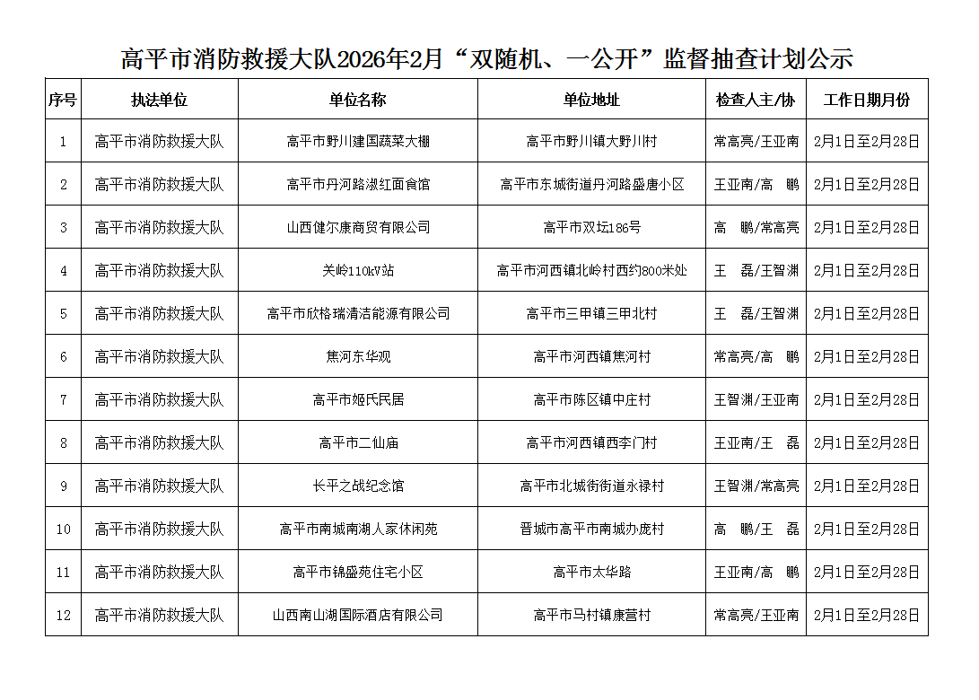 根据相关工作要求,现将2026年2月份“双随机、一公开”消防监督抽查计划予以公示。