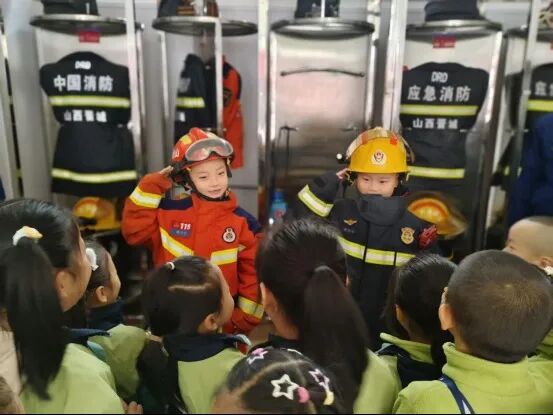 在“变身小小消防员”环节中,孩子们在消防员的帮助下穿上厚重的灭火防护服、戴上头盔,瞬间化身威风凛凛的“小卫士”,真切感受消防员出警时的艰辛与责任。