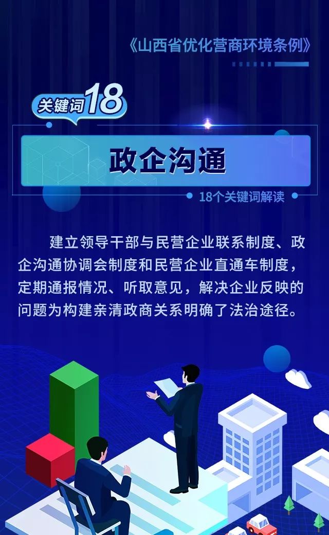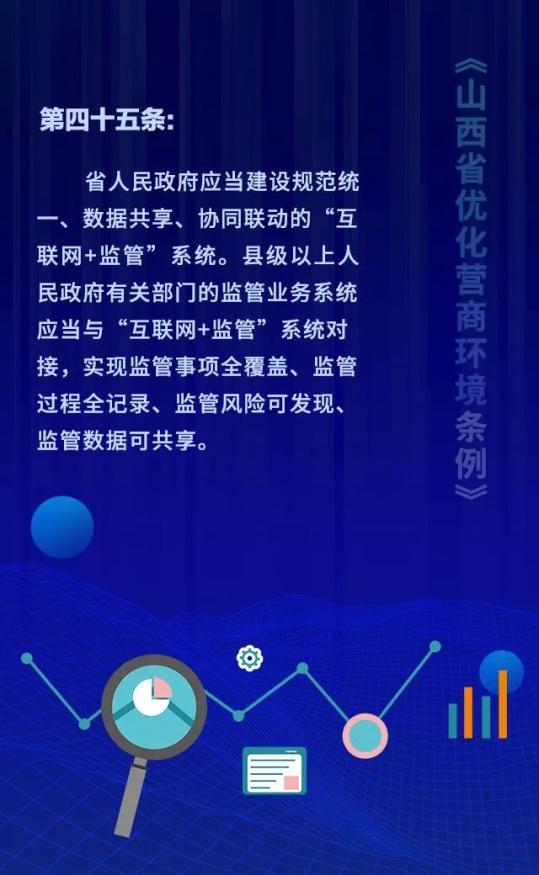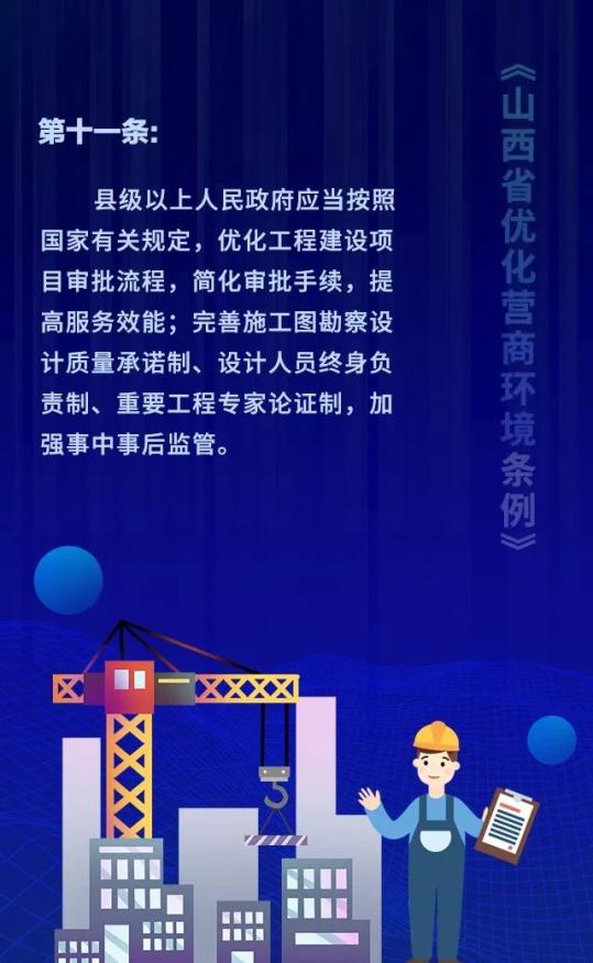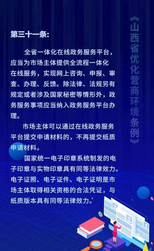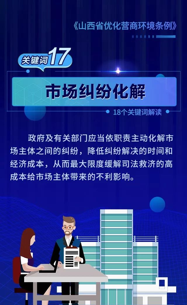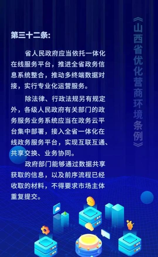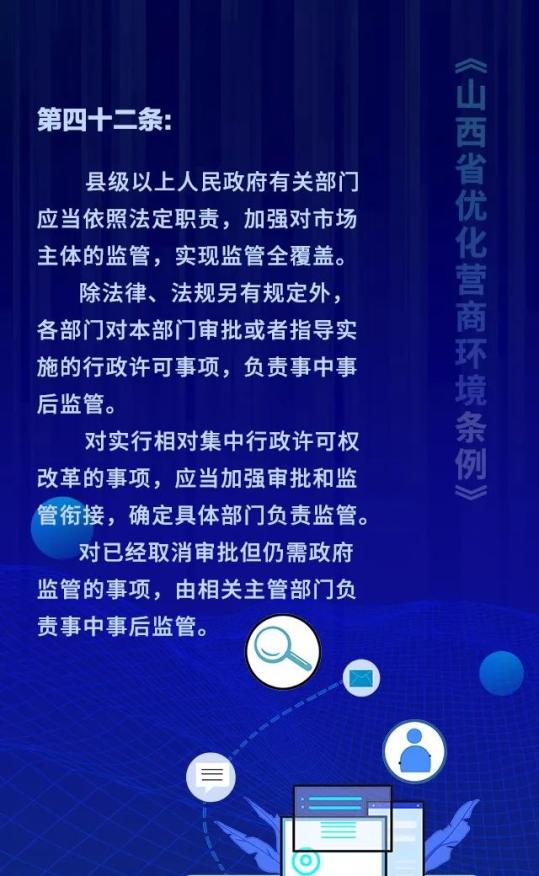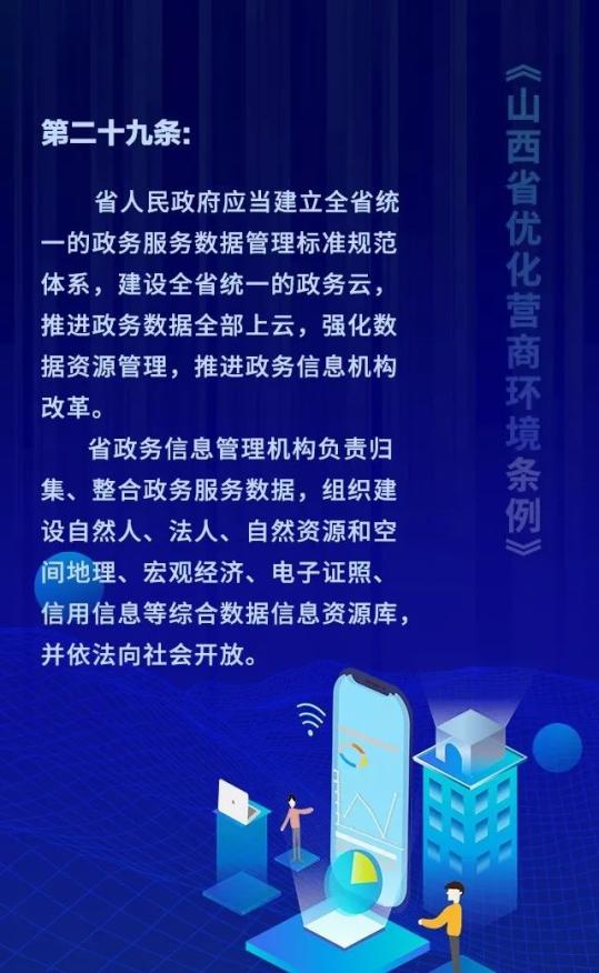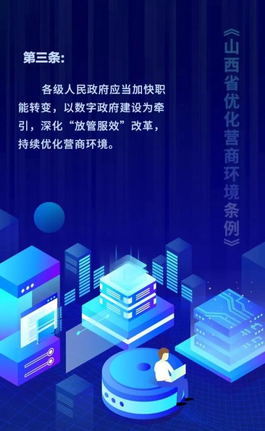 18个关键词!看懂《山西省优化营商环境条例》 来源: 发布时间:2020-07-16 【字体:小 大】 如果内容不能正常显示,请更换浏览器进行重试 第一章 总则第二章 优化审批第三章 市场环境第四章 政务服务第五章 监管执法第六章 法治保障 本页二维码 【打印正文】