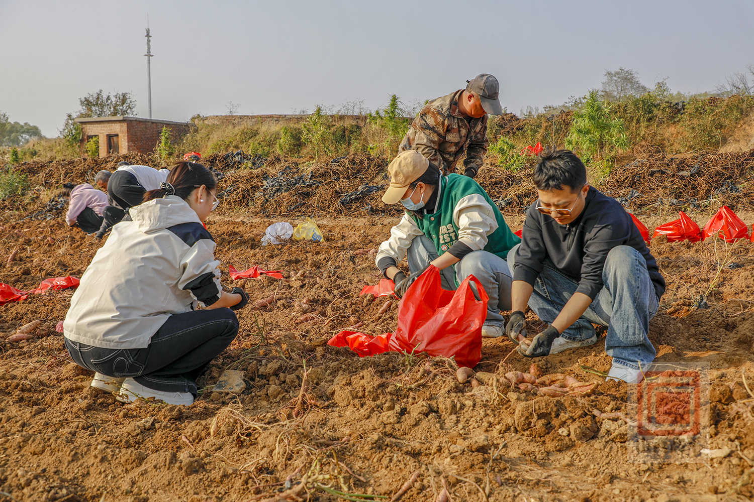 走进红薯种植基地,一派热火朝天的秋收景象映入眼帘。田垄间,挖薯机轰鸣作响,翻起的泥土中,一个个色泽鲜亮的红薯破土而出。社区工作人员、志愿者、居民等分工协作,干劲十足,有的弯腰捡拾、麻利去泥,有的仔细分拣、装袋称重,一袋袋沉甸甸的红薯很快在田边堆成了“小山”。