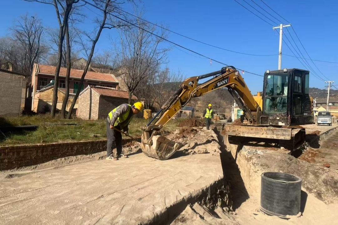 来到原村乡原村村牧沟自然村的项目施工现场,挖掘机开挖沟槽、压实机夯实回填管沟,工人们分工协作,现场有条不紊。项目现场负责人邢素明说:“我们从11月10日开始施工,调配工人机械进行破损路面、开挖管沟、铺设管道等作业,11月底已完成主街道的供排水工程。”