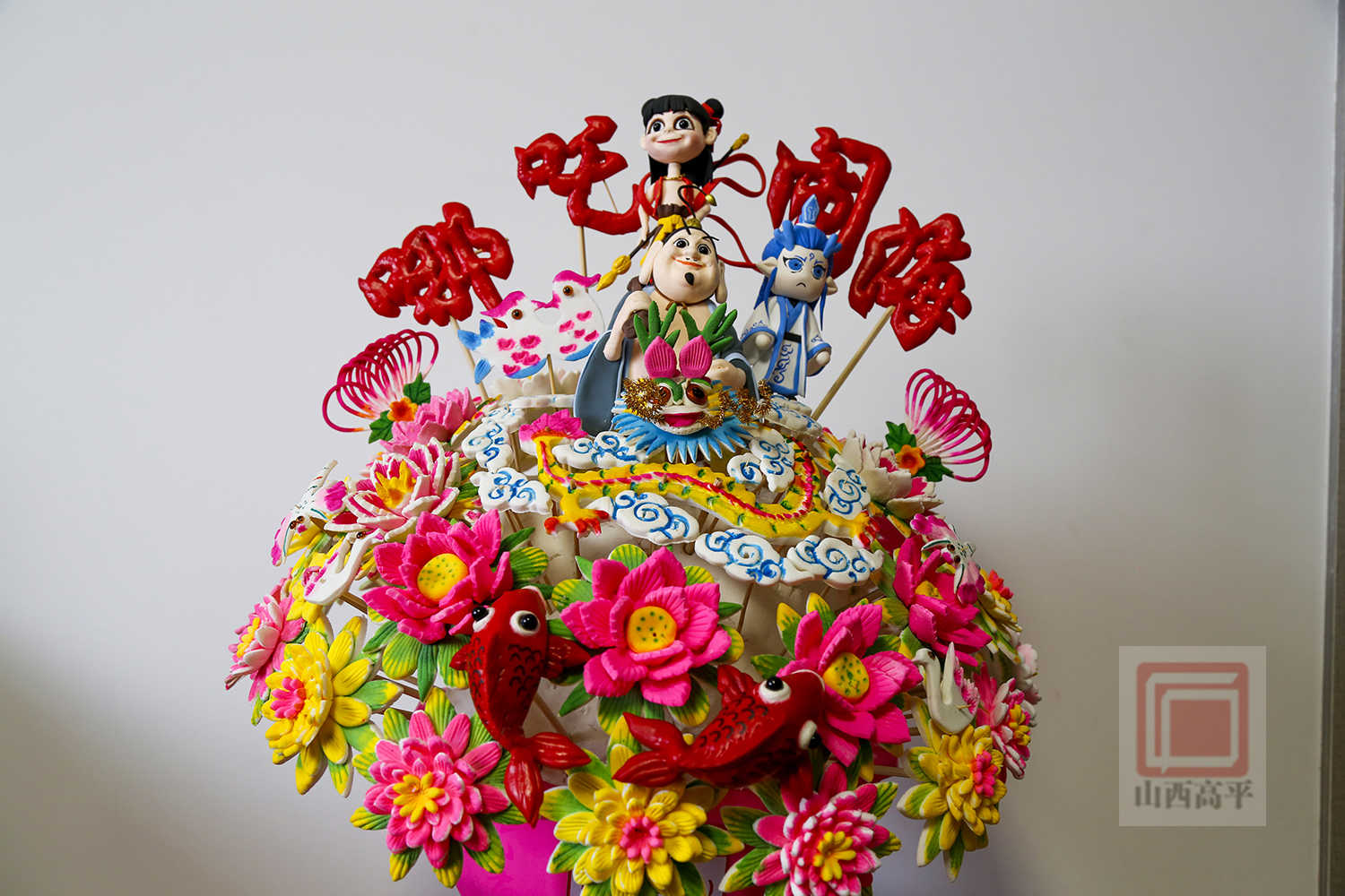 白仙娥说:“去年国产电影《哪吒之魔童闹海》火爆出圈,我就想着把热门动画形象和非遗面塑结合起来。这款‘哪吒闹海’花馍,上面是手持火尖枪、身披混天绫的哪吒,中间是太乙真人,右侧是敖丙,造型鲜活又有辨识度,也让更多年轻人愿意了解面塑这门老手艺。”