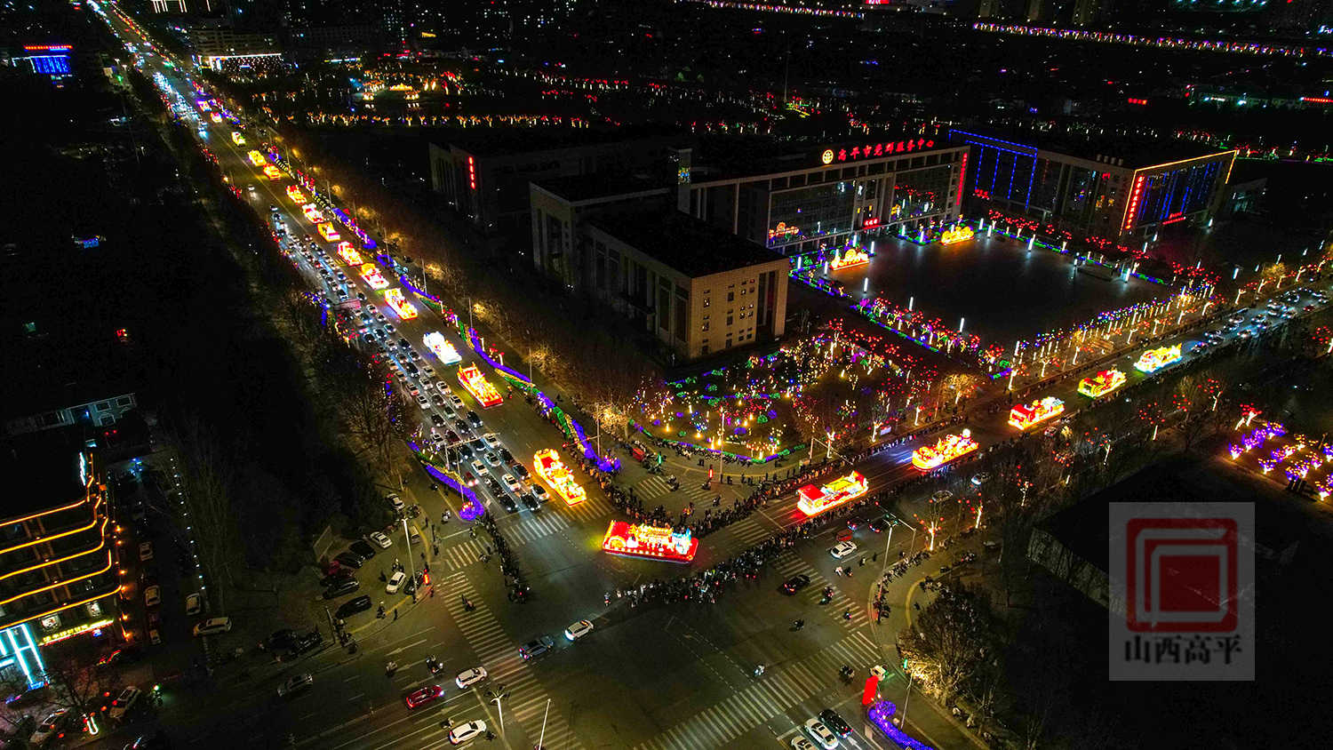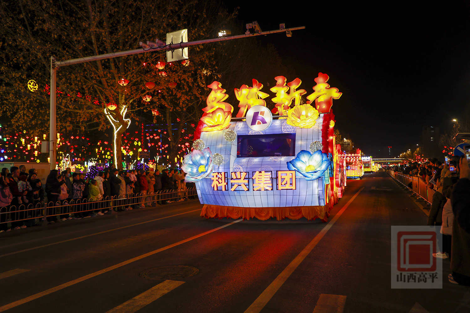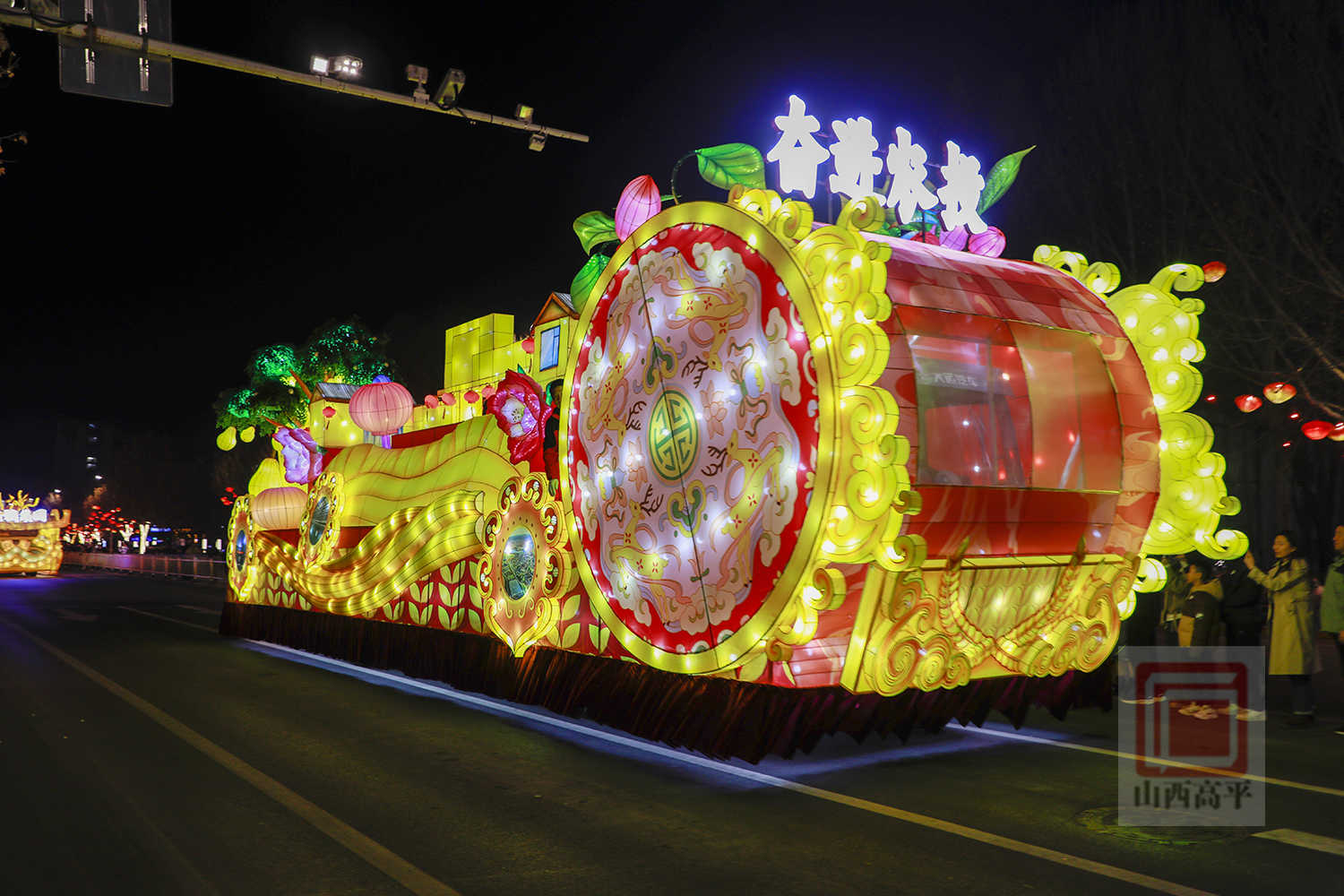 晚上7点30分,伴随着欢快的旋律,代表科兴集团、国投集团、农投集团、文旅集团、恒通集团5家重点企业及全市15个乡镇(街道)的20辆彩车,从高平东站缓缓出发,沿炎帝大道向市区行进。20辆彩车以中国红与金黄为主色调,巧妙融合了生肖骏马、炎帝文化、古建文旅、产业振兴、城乡发展等元素,造型精美、设计独特,全方位展现了高平厚重的文化底蕴、蓬勃的产业活力与日新月异的城市变化。