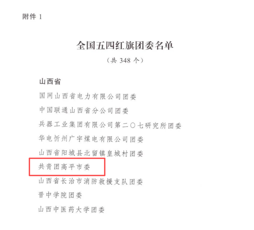 近日,共青团中央印发《关于表彰全国五四红旗团委(团支部)、全国优秀共青团员、全国优秀共青团干部的决定》,授予348个团组织全国五四红旗团委称号、342个团组织全国五四红旗团支部称号、451名同志全国优秀共青团员称号、344名同志全国优秀共青团干部称号。其中,共青团高平市委荣获“全国五四红旗团委”称号。