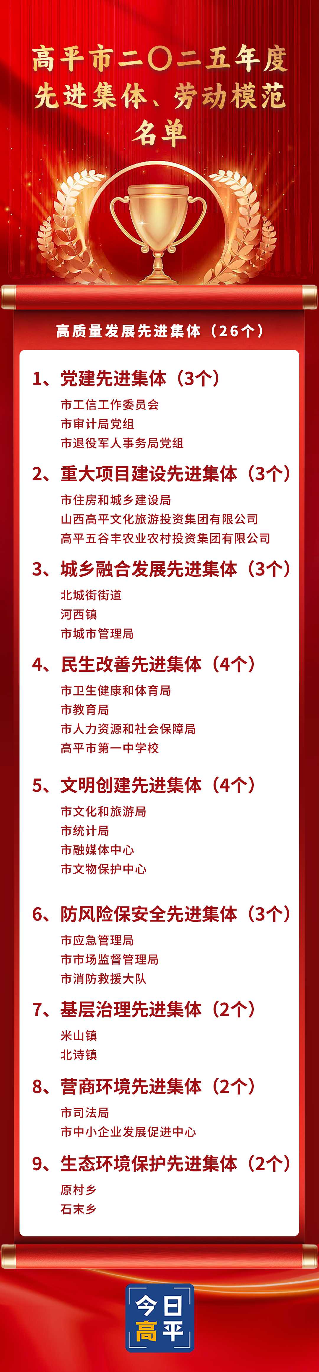 向劳模致敬 与榜样同行!高平市2025年度先进集体、劳动模范名单出炉! 来源:高平市融媒体中心 发布时间:2026-03-05 【字体:小 大】 如果内容不能正常显示,请更换浏览器进行重试 3月5日上午市委农村工作会议暨2025年度劳模表彰大会在市委党校召开会上对我市各行各业涌现出的先进集体和先进个人进行表彰学习标杆 争当先进一起来看高平市2025年度先进集体、劳动模范名单 本页二维码 【打印正文】