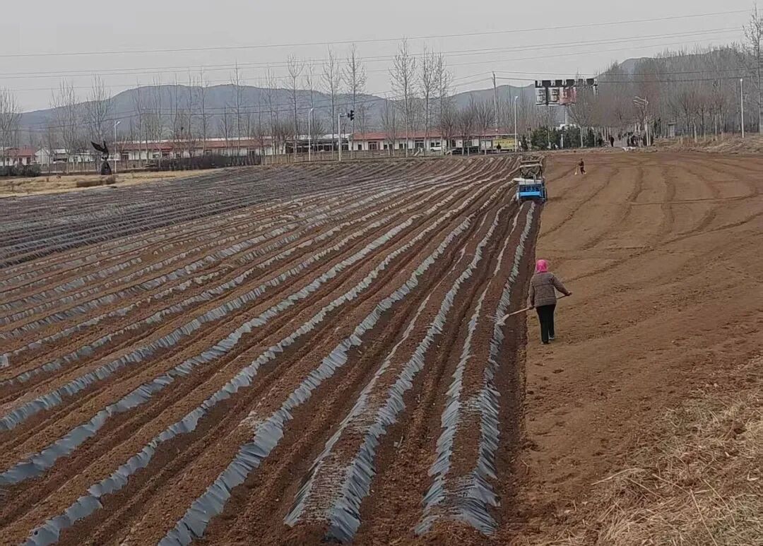 在五谷畦合作社,村民们有序推进红薯种植各项准备工作。随着起垄机驶过,黑色地膜沿着田垄铺展开来,村民们紧随其后,压实土壤。今年该合作社计划种植300亩红薯,目前已完成30亩地块的高垄起垄作业,并同步采用0.015mm黑地膜覆盖,通过标准化整地与科学覆膜,为后续红薯定植、苗期管理及提质增产打下坚实基础。