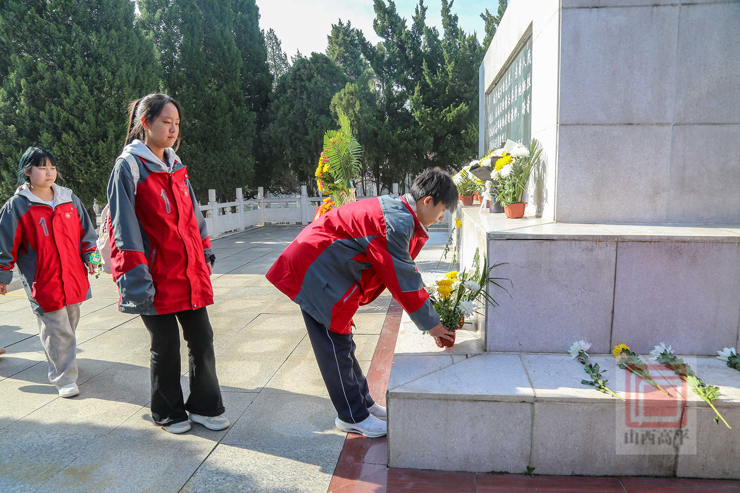 走进烈士陵园,松柏苍翠,丰碑矗立。在革命烈士纪念碑前,来自高平一中实验校的部分师生整齐列队,奏唱国歌、肃立默哀,缅怀革命先烈的丰功伟绩,寄托对英烈的深切哀思。默哀毕,师生们缓步上前,向革命烈士纪念碑敬献花篮与鲜花,以朴素庄重的方式,表达对革命先烈的追思与敬意。