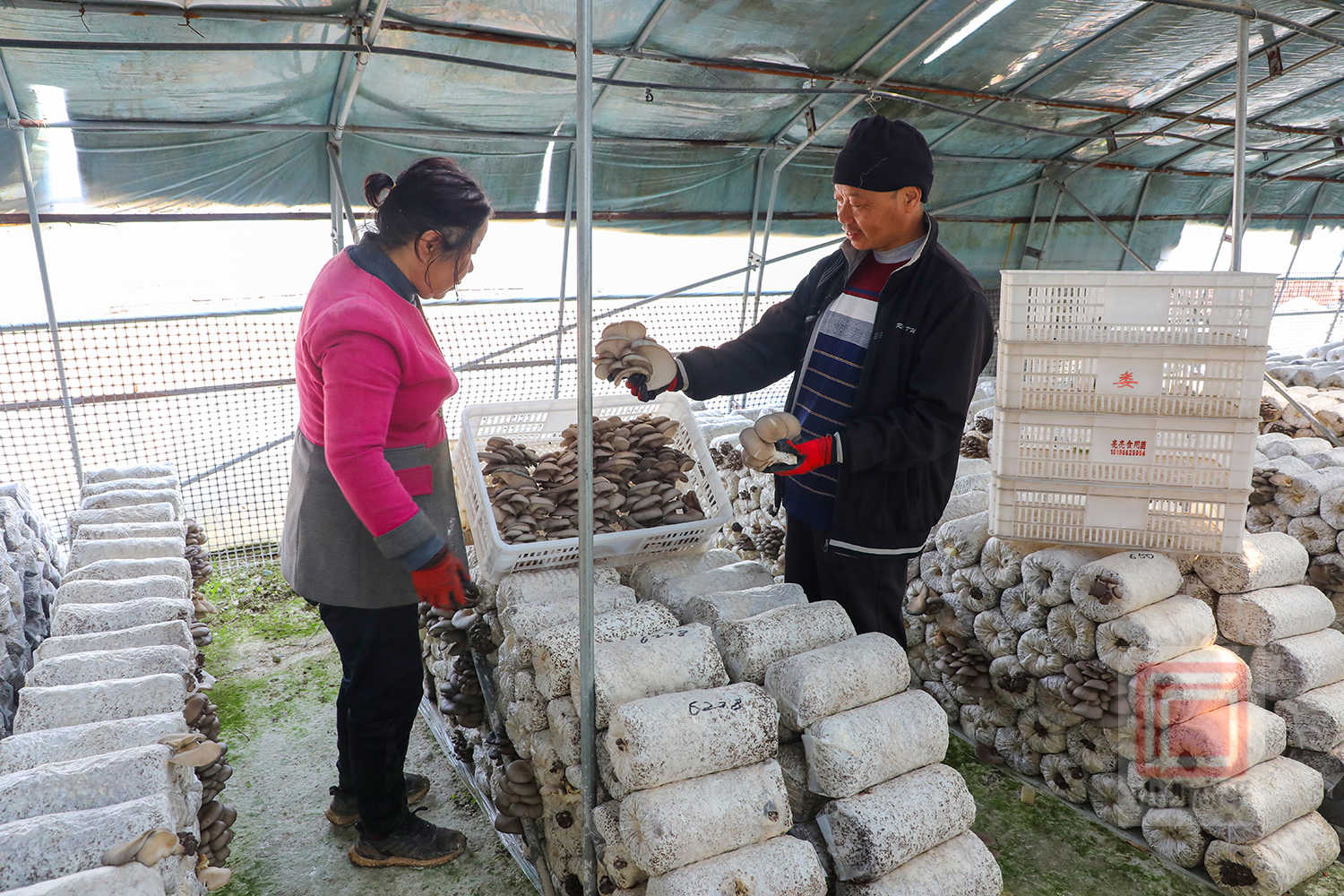 走进平菇食用菌大棚,一股浓郁的菌香扑鼻而来。一排排菌袋整齐摆放,一簇簇平菇从菌棒中破袋而出,宛如层层叠叠的小伞,肥厚饱满、长势喜人。村民们穿梭其间,娴熟地摘下饱满、品相好的平菇,然后分拣、装袋,现场一派丰收景象。
