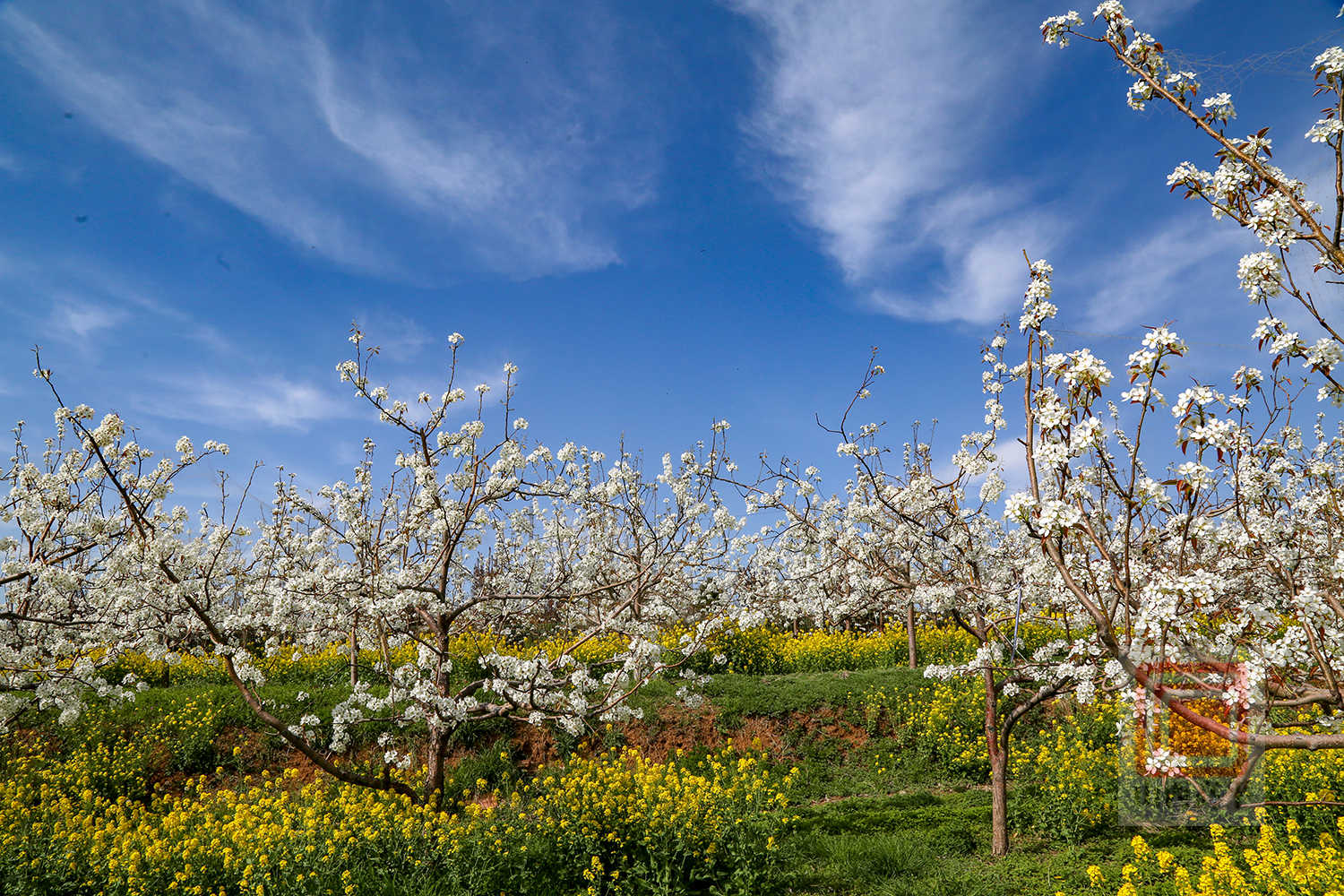 来到琚庄村梨园,洁白的梨花缀满枝头,层层叠叠、挨挨挤挤,在暖阳的映照下愈发晶莹剔透、清雅脱俗。放眼望去,白色的花海与蓝天、绿树、油菜花、乡间小道相映成趣,构成了一幅生动的春日画卷。