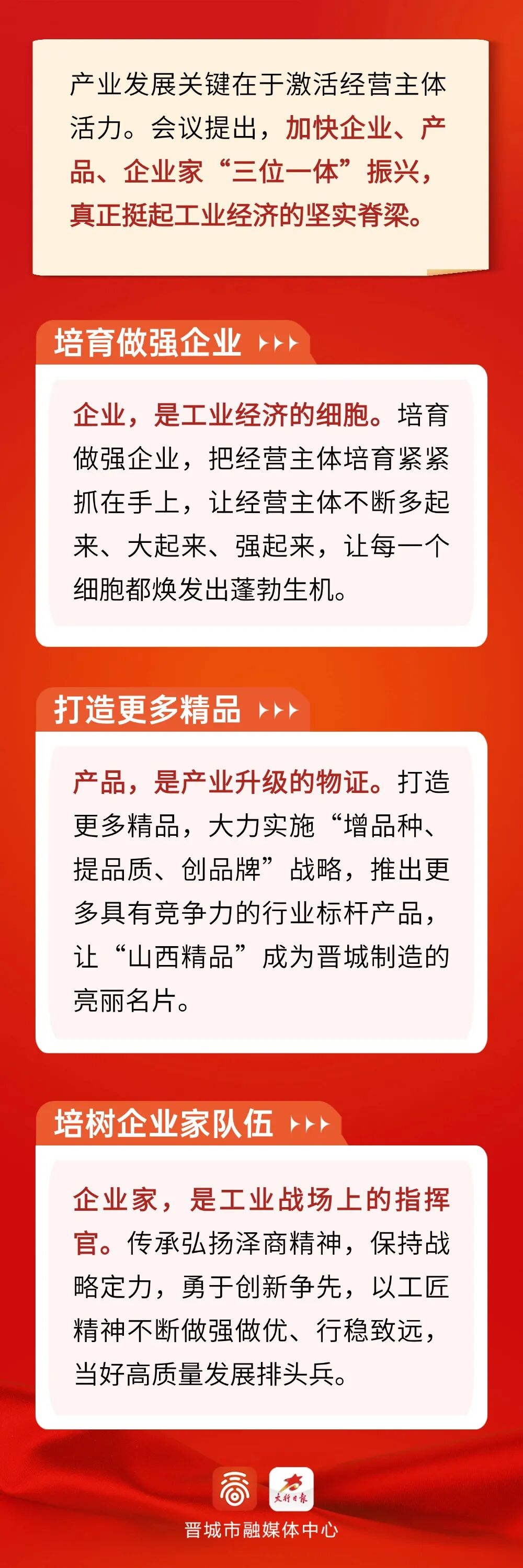 大抓工业 大兴产业丨坚持分类施策,加快“三位一体”振兴! 来源:晋城市人民政府网 发布时间:2026-03-02 【字体:小 大】 如果内容不能正常显示,请更换浏览器进行重试 日前,全市“大抓工业 大兴产业”加快推进新型工业化会议召开。会议要求,要掌握规律方法,加快形成“大抓工业、大兴产业”的新动能新优势;坚持分类施策,加快企业、产品、企业家“三位一体”振兴;指导帮助企业练好内功、固本强基、挺起工业经济的坚实脊梁。 企业强,则工业强;产品精,则产业兴;企业家有为,则发展有望。“三位一体”夯实的不仅是工业经济的根基,更是一座城市转型发展的信心。 本页二维码 【打印正文】