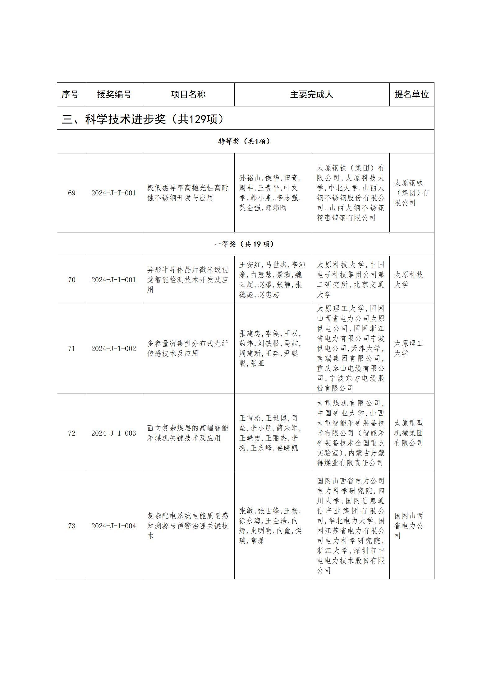根据《山西省科学技术奖励办法》等有关规定,经省科学技术奖励评审委员会评审、省委科技委员会审定,授予“遗煤开采承载结构失稳致灾机理及关键域充填储碳空间重构方法”和“极低磁导率高抛光性高耐蚀不锈钢开发与应用”2个项目特等奖,授予“异形半导体晶片微米级视觉智能检测技术开发及应用”等36个项目一等奖,授予“高密度高精度微电子组装智能装备关键技术及应用”等161个项目二等奖,授予“晋能控股装备制造集团有限公司”等6个企业技术创新奖。