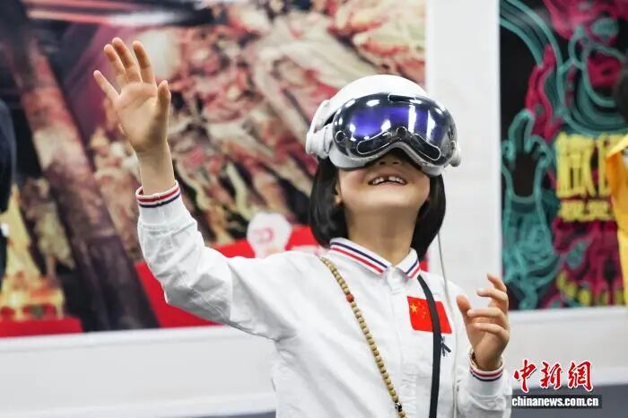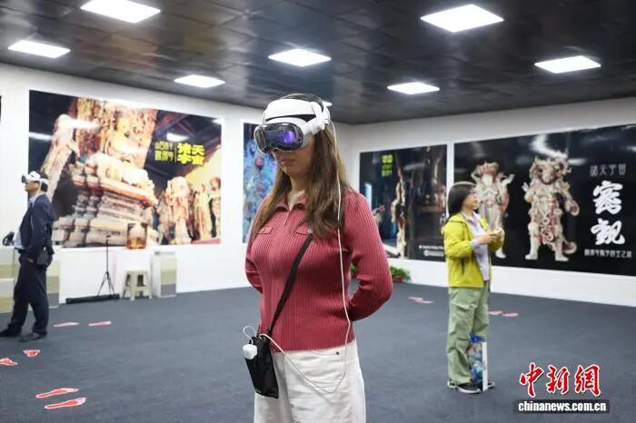 10月3日,游客在铁佛寺室外小广场进行“诸天宇宙”铁佛寺彩塑MR(混合现实)体验。这项体验实现了对铁佛寺二十四诸天造像1:1立体还原,观众可零距离欣赏彩塑造像。据介绍,该MR项目对古建、彩塑进行标准化数据采集与工业化生产,相关数字资产不仅可用于MR体验、线上展览,还能复用至纪录片制作、游戏开发、文创设计等领域,形成“一次生产、多元应用”的产业模式。中新网记者 杨郁然 摄