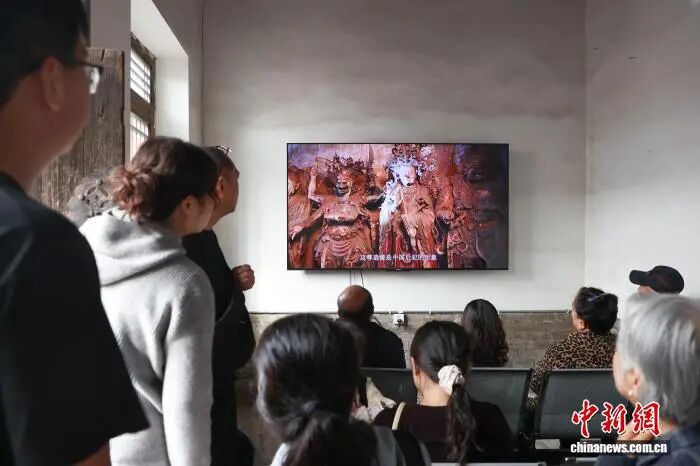10月3日,游客在铁佛寺东厢房内观看殿内彩塑的讲解视频。中新网记者 杨郁然 摄