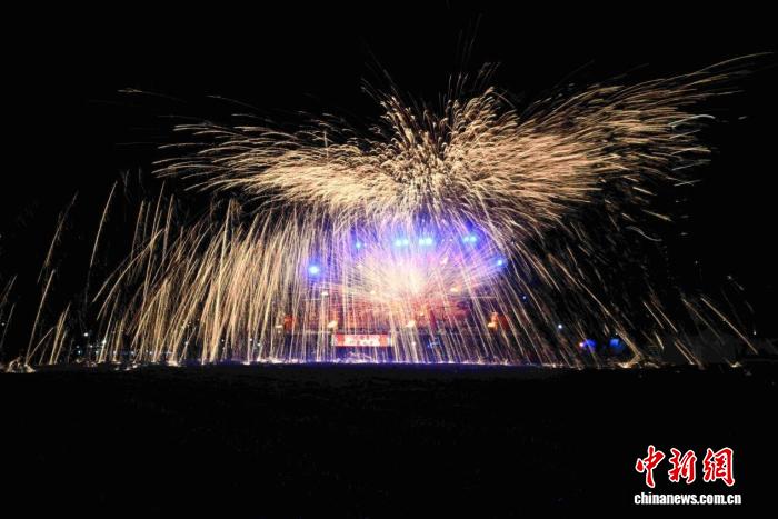 2月24日晚,来自山西高平的非物质文化遗产代表性项目打铁花表演在台湾新北市大都会公园上演。中新社记者刘大炜 摄
