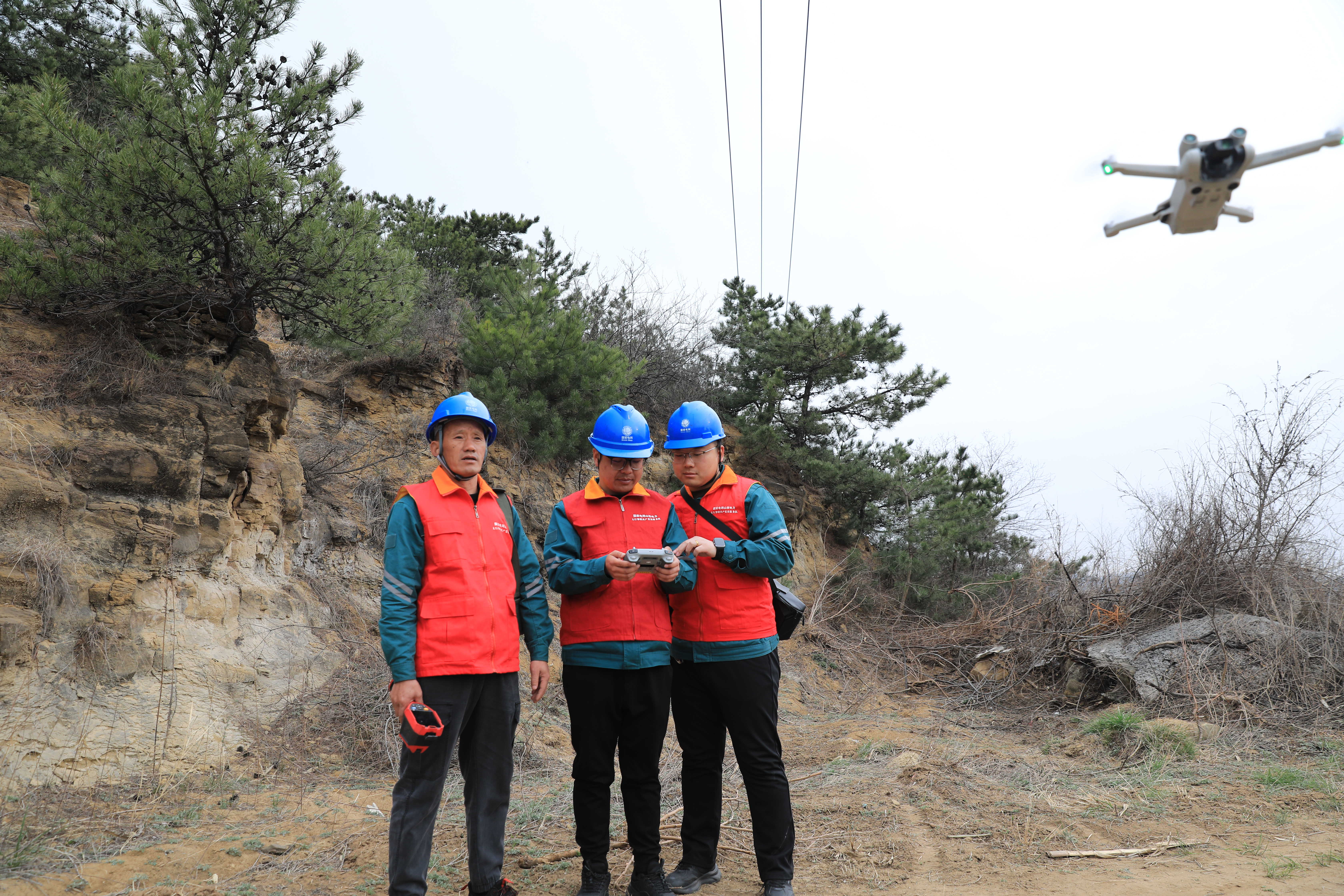 3月26日,在山西省高平市野川镇圪台山上,高平供电公司野川供电所3名运维人员头戴安全帽、身着红马甲,行走在春日山林间。他们或手持测温仪,或高举望远镜,或起飞无人机,仔细对穿越林区的10千伏867吴庄线供电设备进行巡视检查。