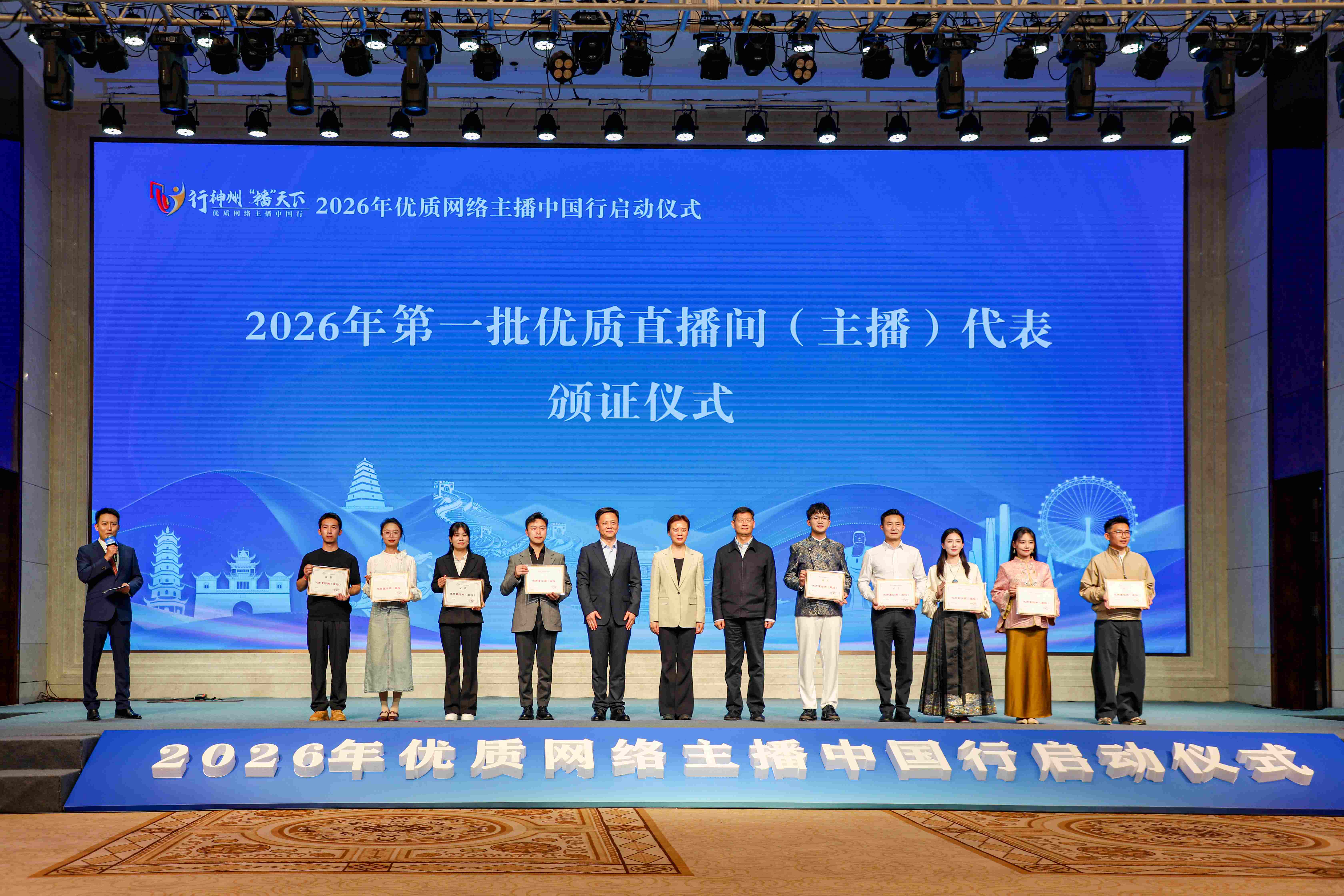 启动仪式现场,2025年优质网络主播中国行的地方代表及主播代表依次登台,分享了他们行走神州、传播发展的所见所感与所思所悟;同时,现场为2026年第一批优质直播间(主播)代表颁发证书,进一步发挥优质主播的示范引领作用。