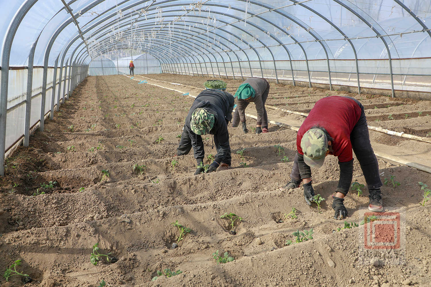 走进圪台村蔬菜种植基地,连片的春秋大棚错落有致,棚内暖意融融、生机盎然,一派春忙景象。村民们分工劳作,弯腰栽苗、培土压实,随后用滴水管均匀地为幼苗浇水,确保幼苗成活率。一株株新栽下的幼苗嫩绿舒展,孕育着丰收的希望。
