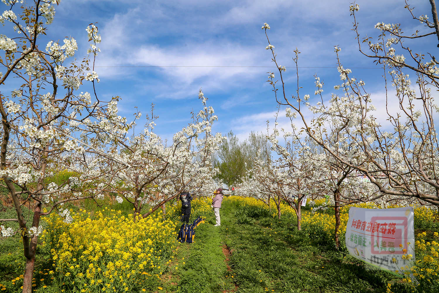 来到琚庄村梨园,洁白的梨花缀满枝头,层层叠叠、挨挨挤挤,在暖阳的映照下愈发晶莹剔透、清雅脱俗。放眼望去,白色的花海与蓝天、绿树、油菜花、乡间小道相映成趣,构成了一幅生动的春日画卷。