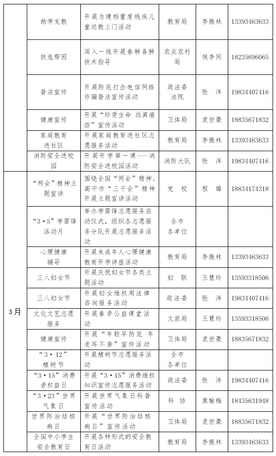 为做好2025年高平市新时代文明实践工作,市新时代文明实践中心征集、汇总各志愿服务队的文明实践计划,选取有代表性的部分活动,形成《2025年高平市新时代文明实践活动计划》。为使活动项目更好地服务于基层和广大群众,按照“群众点单、中心派单、志愿者接单、群众评单”志愿服务模式,现将新时代文明实践活动计划予以公示,各单位和广大群众可通过电话、“今日高平”APP或直接到市新时代文明实践中心(所、站)及各单位“点单”,中心将及时予以“派单”,根据群众所需在规定范围内将实践活动项目落实到基层。
