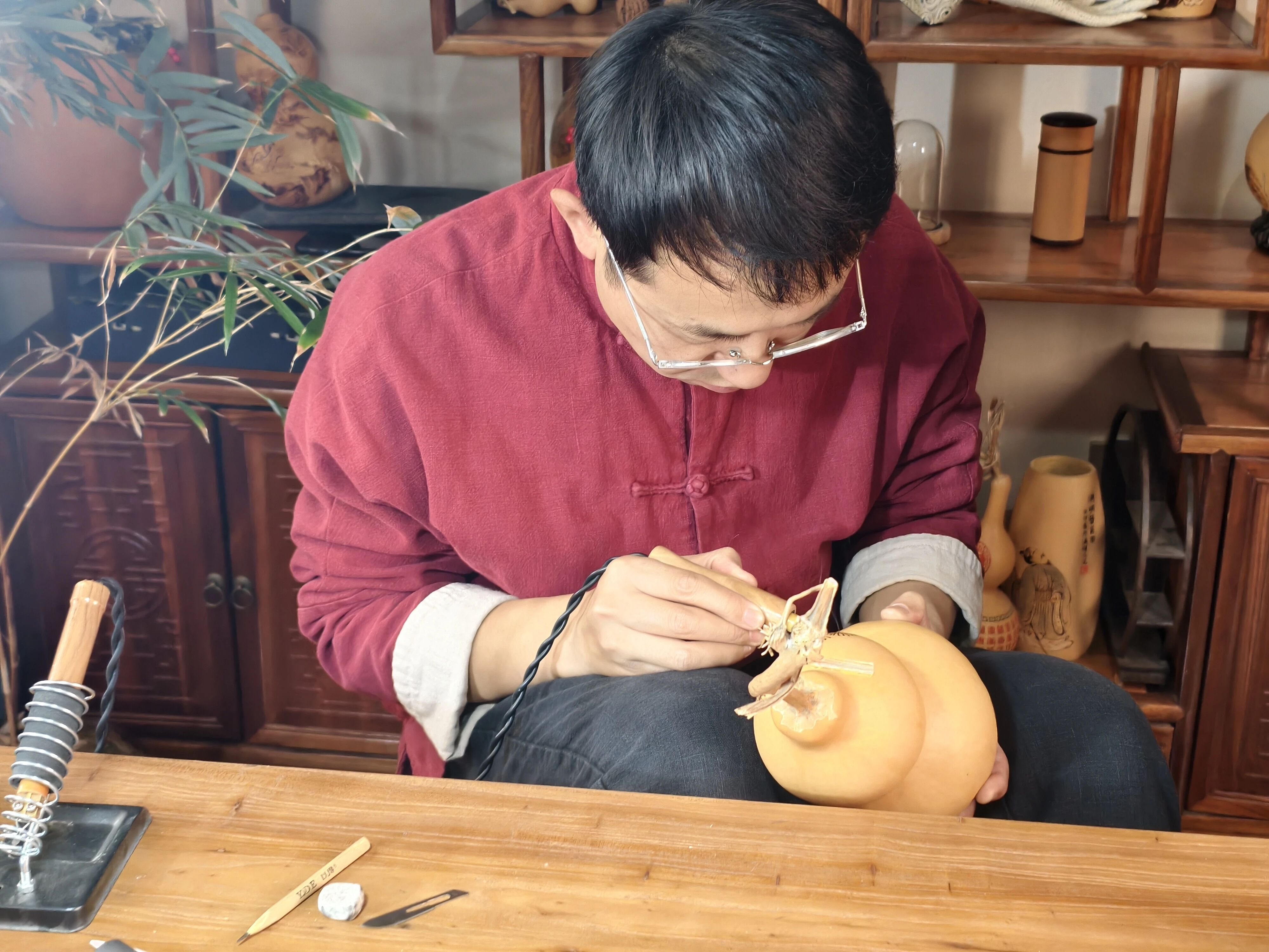 十二余年。从最初笨拙的烫手,到如今举重若轻的游刃,电烙笔已成为他手的延伸。但比技艺更难得的,是那份定力——在这个什么都可以速成的时代,依然选择用最慢的方式,与时间博弈。