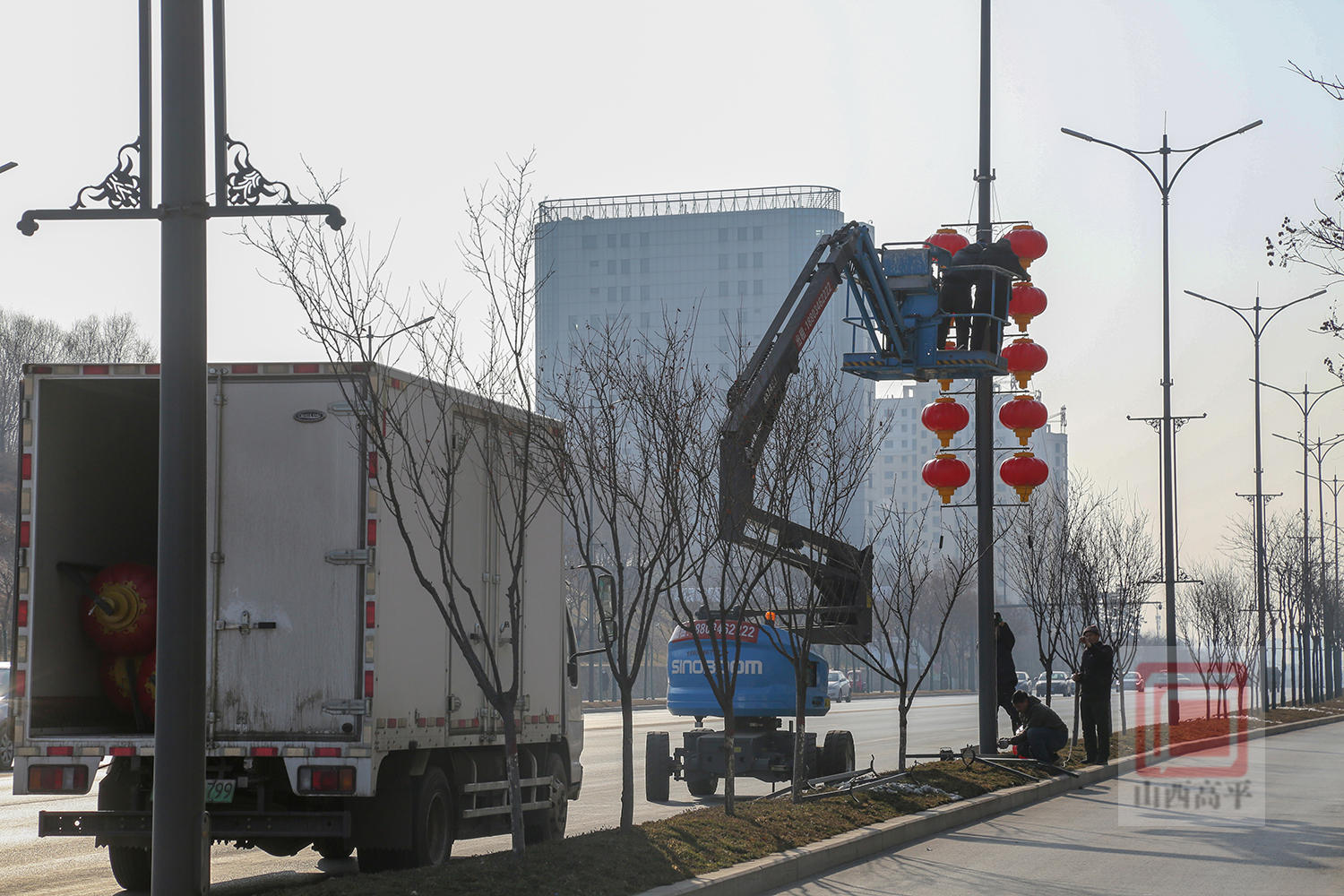 “我们主要负责高速路口至高平中专路段的亮化装点工作,需要在灯杆上悬挂大红灯笼,现场有20余名工人正在进行亮化作业,还配备了多台吊车和多个梯子,确保可以如期完成亮化工作。”在炎帝大道,现场负责人王书明一边指导工人挂灯,一边介绍道。