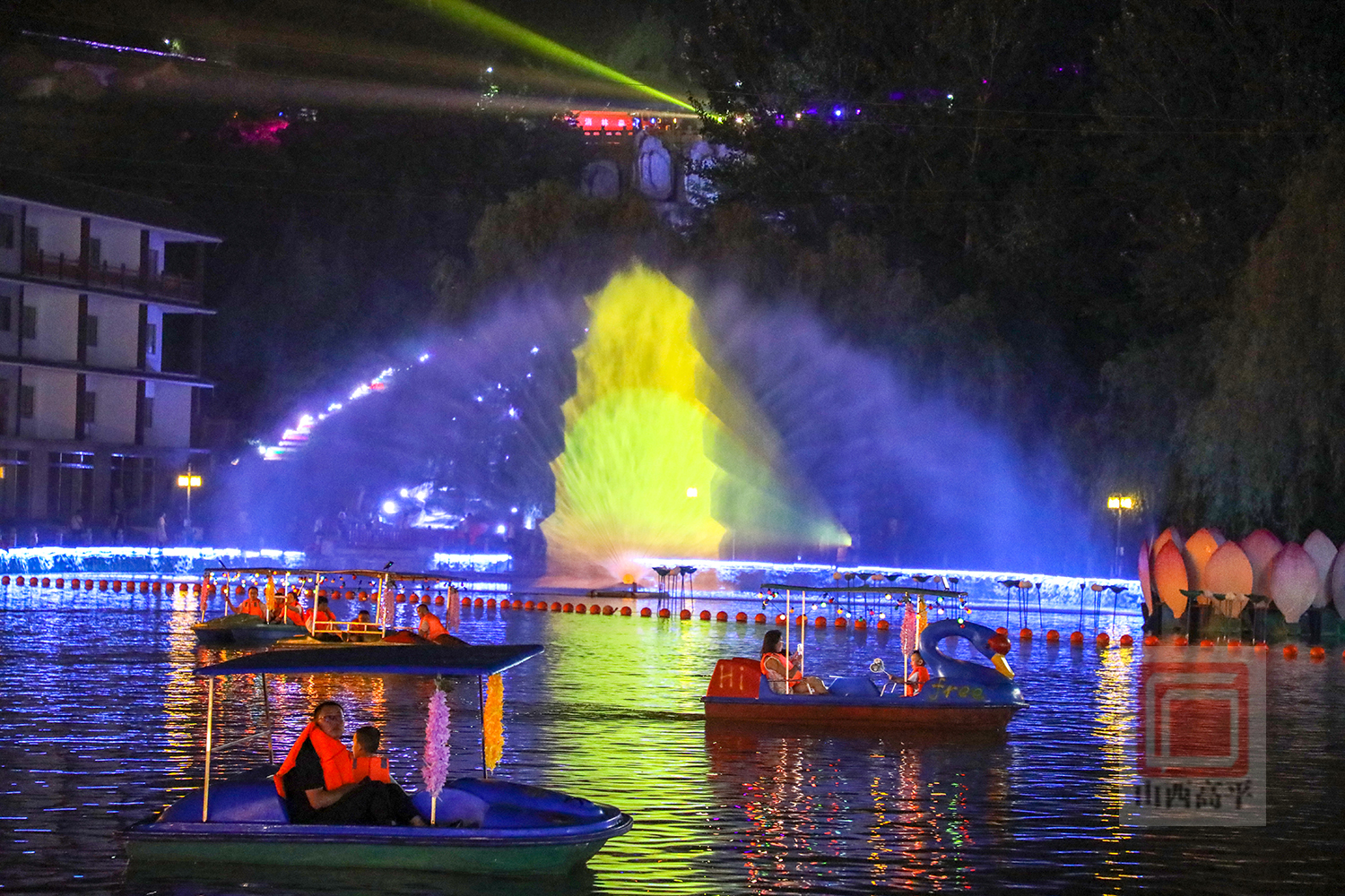 水上市集,热闹不已。摆放的特色美食、手工艺品、各色鲜花,琳琅满目,极具东南亚风情。伴着美轮美奂的水幕光影,游客们泛舟湖上,品尝特色美食,欣赏精彩演绎,感受到了浓郁的东南亚风情。