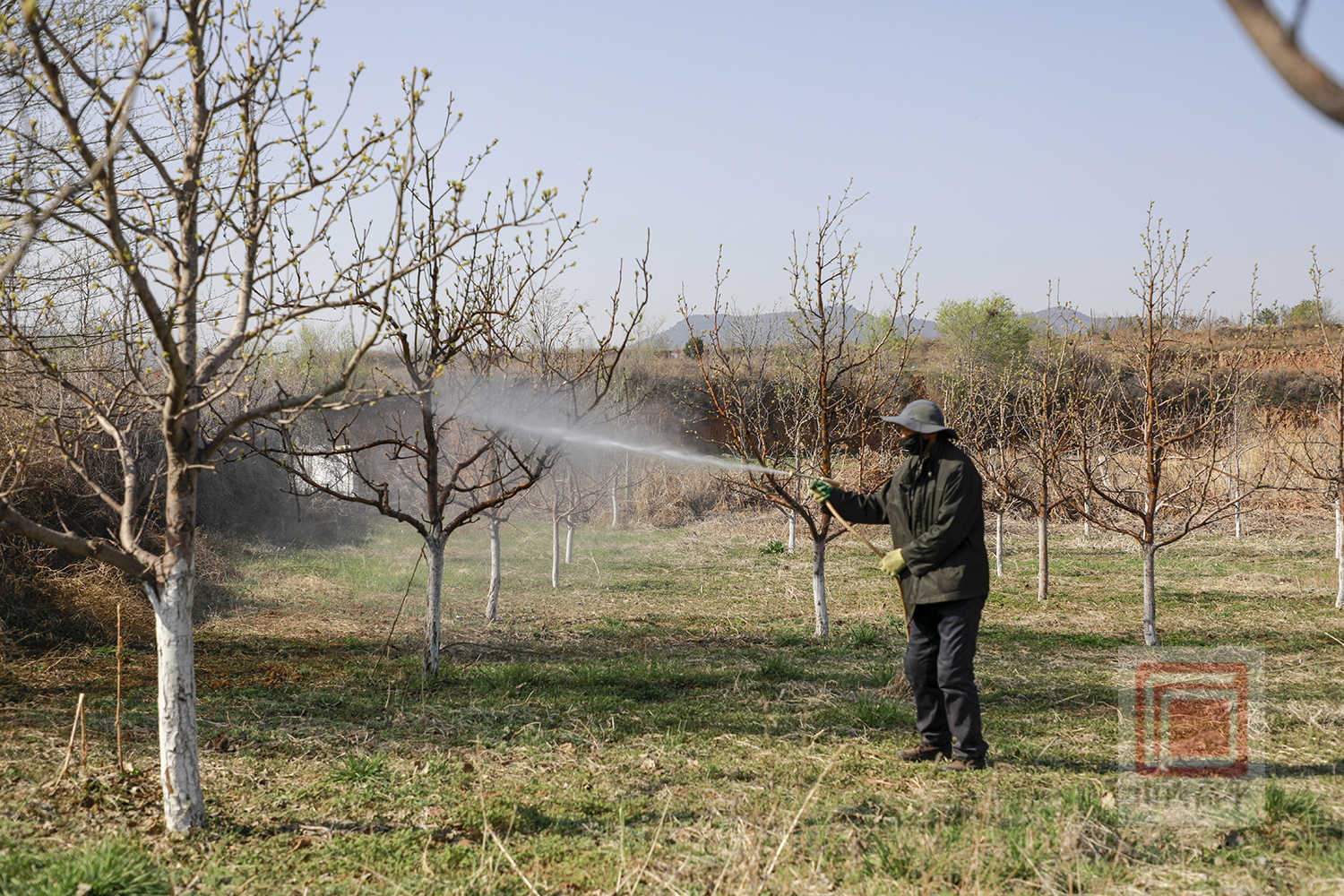 今年70岁的技术员李地宝说:“梨树花前是越冬病虫害苏醒、活动的关键节点,此时的病虫害活动范围集中,抓住这个时机精准打药,能大范围杀灭梨木虱、蚜虫这些害虫,预防黑星病、锈病、腐烂病等常见病害,为后续开花、坐果打好基础。”