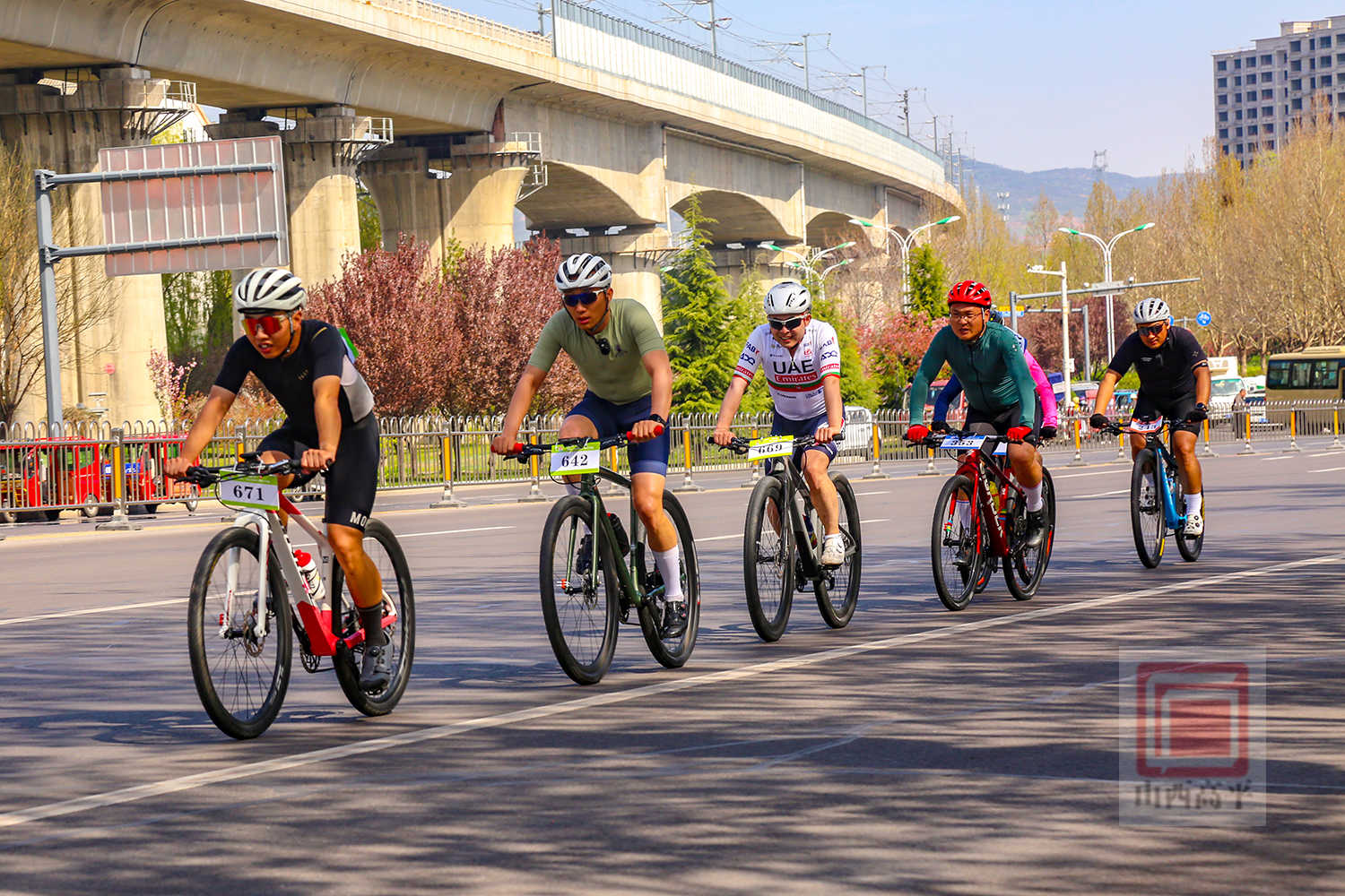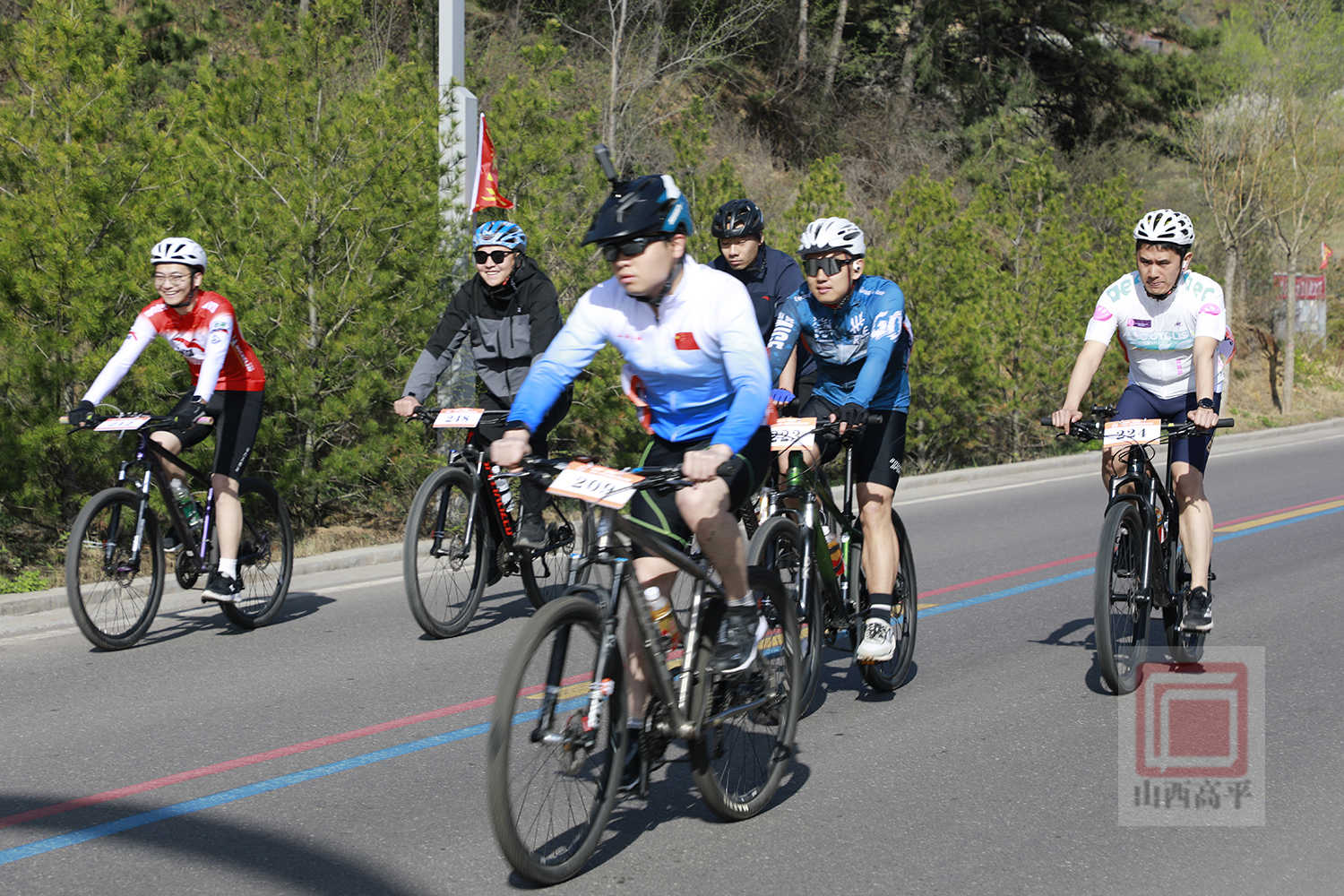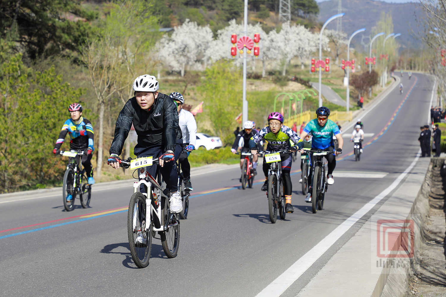 四月春风和煦,草木繁茂,太行一号公路沿线的连翘、梨花、油菜花、桃花竞相绽放,清风携花香沁人心脾。随着发令枪响,选手们如离弦之箭冲出起点,沿太行一号公路自由骑行。大家凭借着娴熟的骑行技巧和顽强的毅力,顺利抵达七佛山圣境门楼,尽情展现出了骑行运动的独特魅力和奋勇拼搏的体育精神。