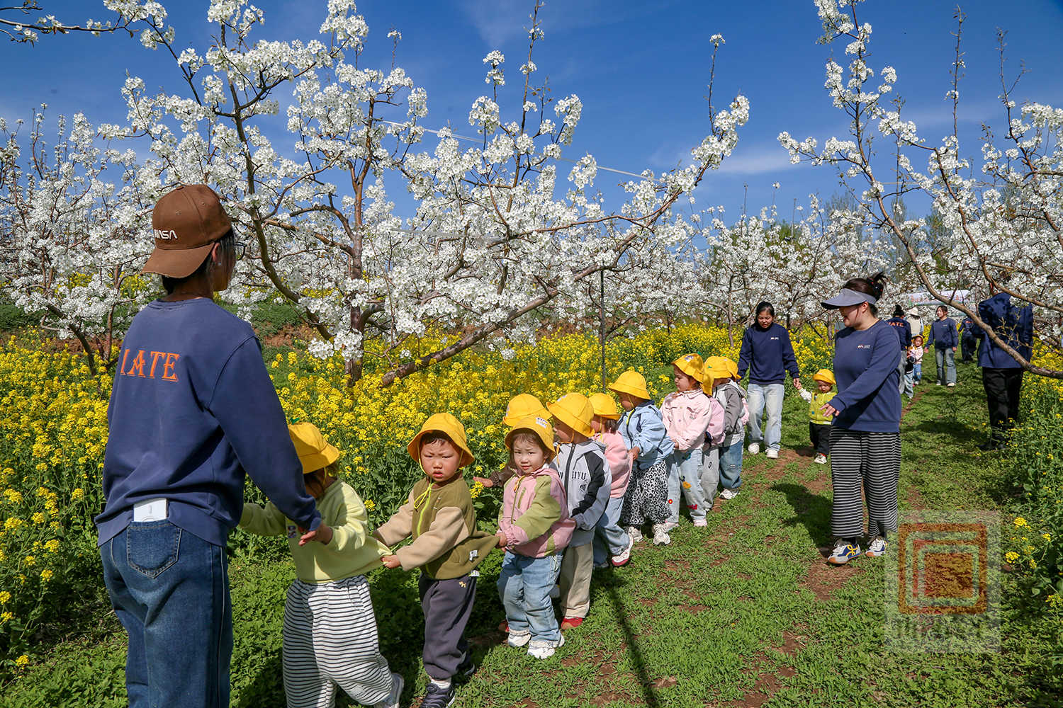 花海之间,一场别开生面的研学实践活动正热闹开展。小朋友们在老师的带领下亲近大自然、探寻春天。小朋友俯身轻嗅梨花芬芳,认真观察植物生长形态,动手制作创意手工,在花海中开展趣味游戏,为烂漫春光增添了满满的童真与活力。
