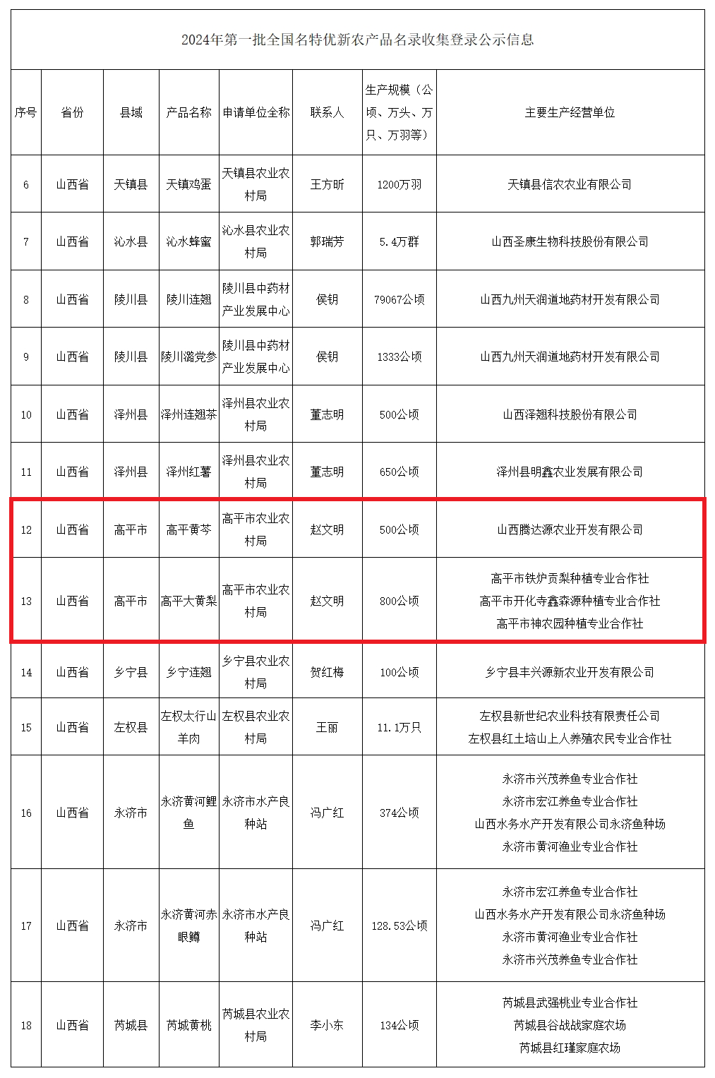 近日,农业农村部农产品质量安全中心发布了《2024年第一批全国名特优新农产品公示》,410个产品拟纳入“全国名特优新农产品”名录。其中,高平黄芩、高平大黄梨2种农产品上榜。