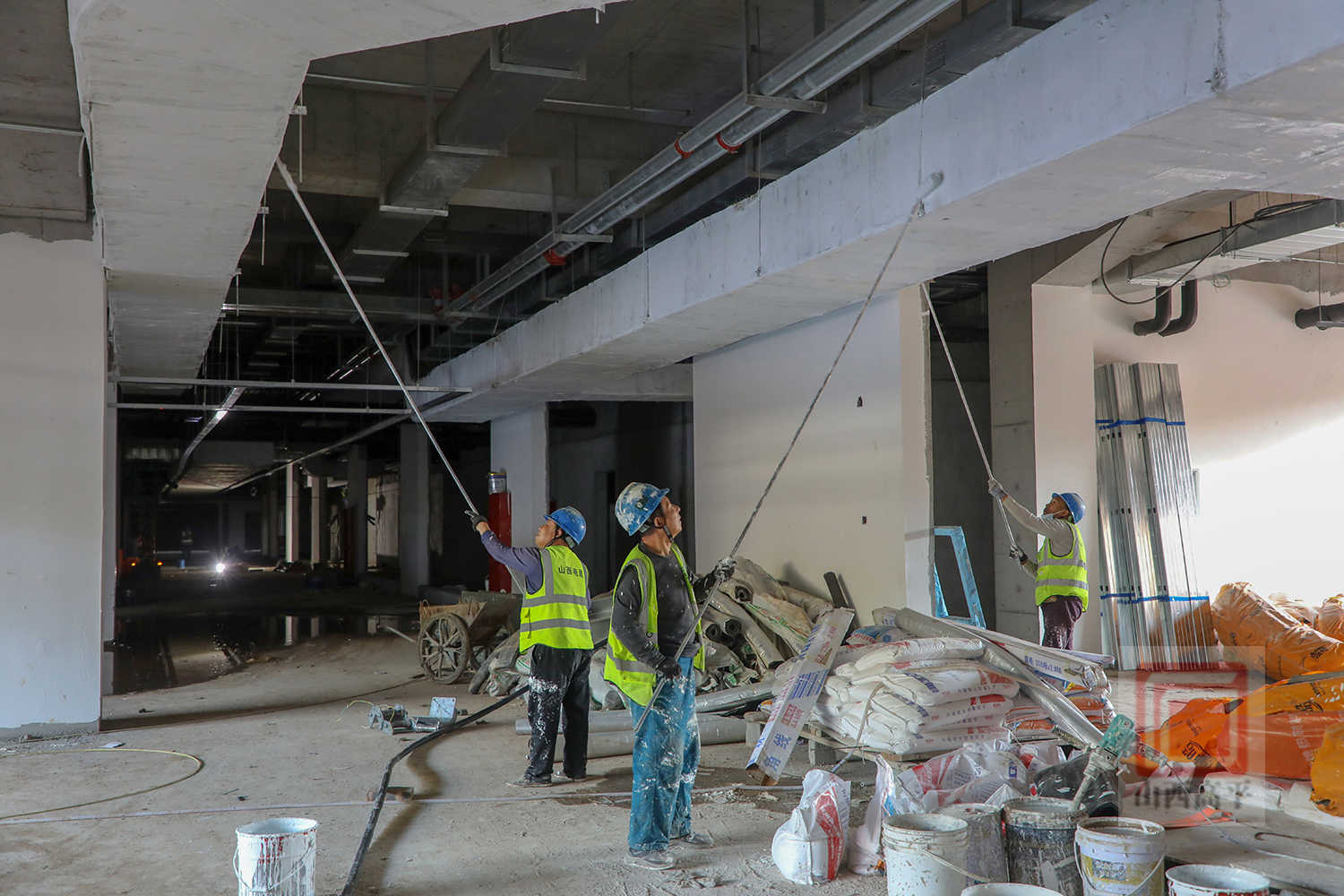 走进项目施工现场,300余名工人分布在各个作业区域,有条不紊地推进室内吊顶安装、窗户安装、外墙装修等装饰装修作业。大家精神饱满、干劲十足,争分夺秒与时间赛跑,全力推进项目建设进度。