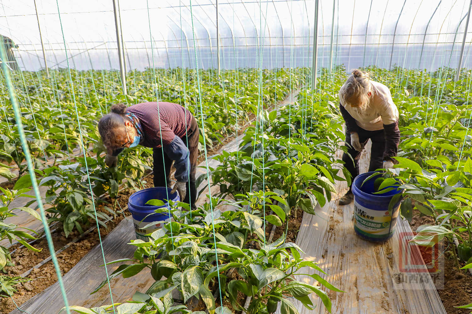 玺田农业现代化发展有限公司建有9栋温室大棚,5栋春秋大棚,规模化种植青椒、西葫芦、西红柿等绿色蔬菜,有效带动了10余名村民就业。目前,7栋青椒大棚已进入采收期,每栋大棚年产蔬菜约2万斤,人均年增收可达2万元,大棚蔬菜种植产业成为了村民们的致富产业。