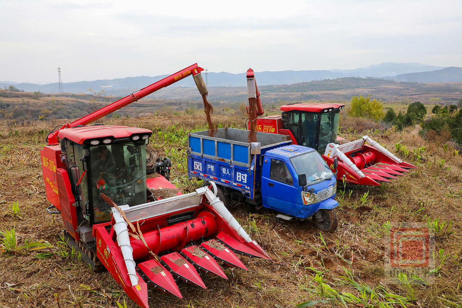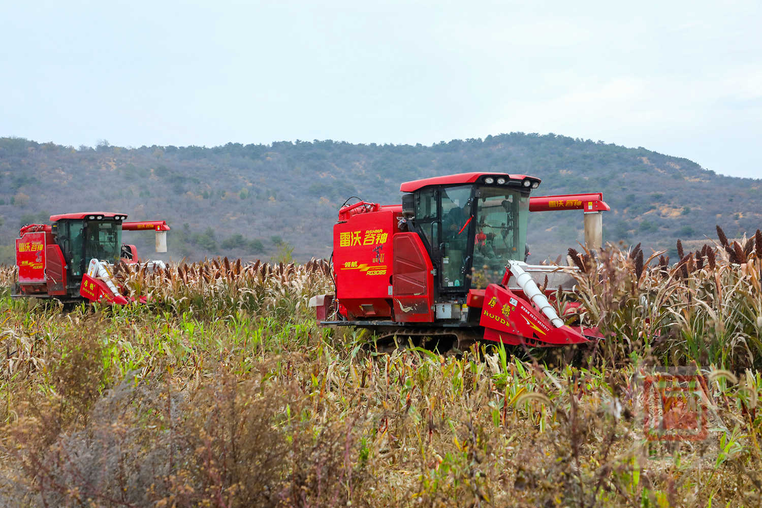 在原村乡后山村,红彤彤的高粱俏丽枝头、穗粒饱满。农机手驾驶着联合收割机开足马力收获高粱。伴着机器驶过,一排排高粱植株连秆带穗被卷入机器中,收割、脱粒、装车,一气呵成。两台运输车往返运送,将高粱及时送往加工厂进行烘干作业。