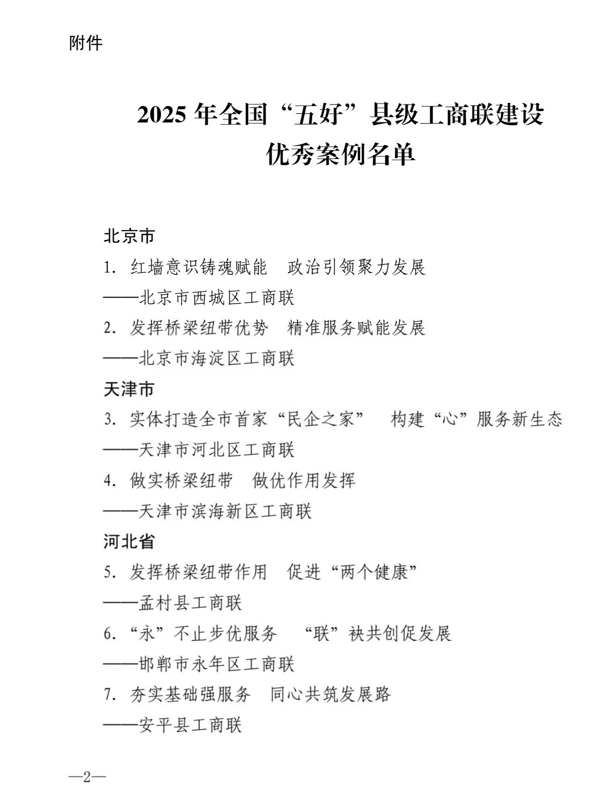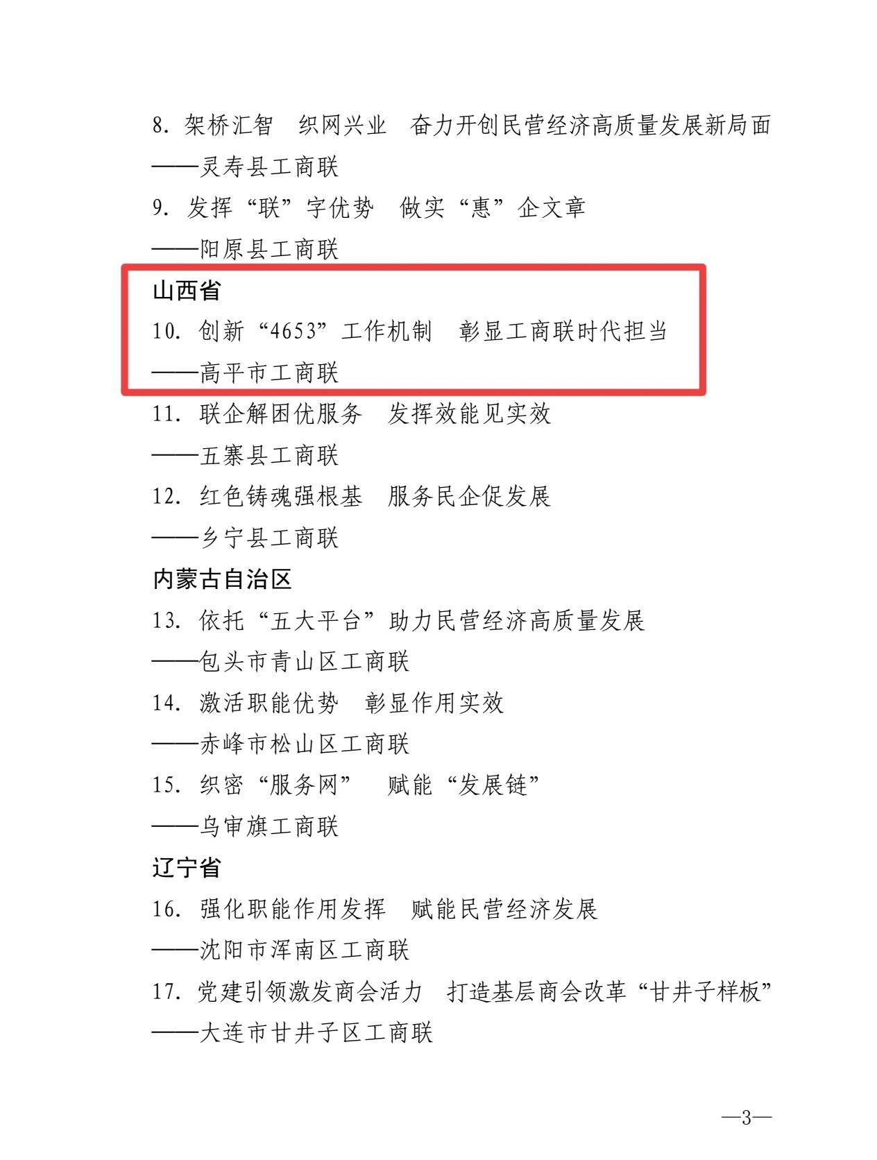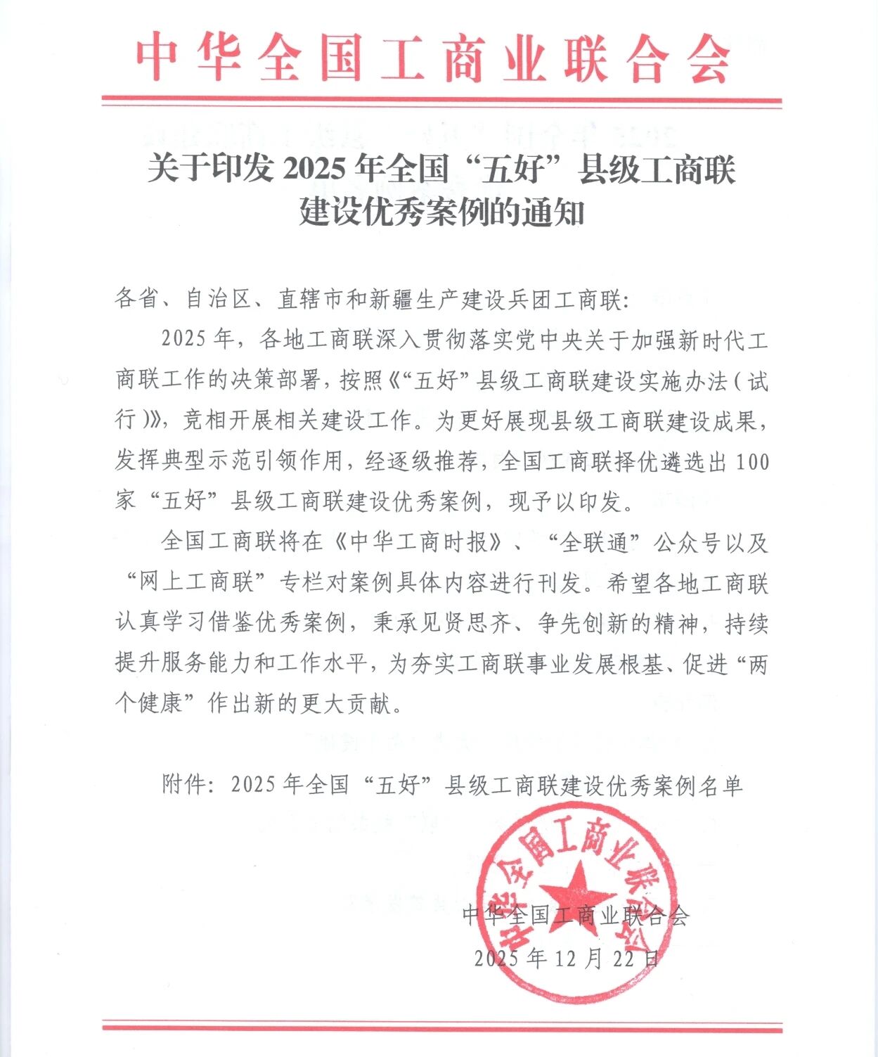 喜报!高平市工商联再获全国工商联表彰 来源:全国工商联 发布时间:2025-12-24 【字体:小 大】 如果内容不能正常显示,请更换浏览器进行重试 12月22日,全国工商联印发《2025年全国“五好”县级工商联建设优秀案例的通知》,公布了100家“五好”县级工商联建设优秀案例,高平市工商联服务民营企业的《创新“4653”工作机制 彰显工商联时代担当》案例成功入选。 本页二维码 【打印正文】