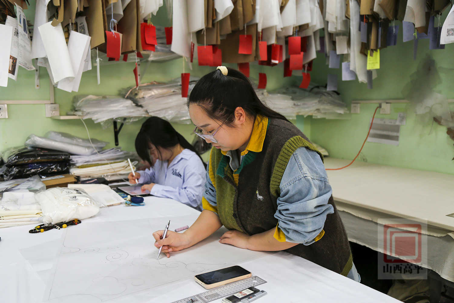 高平丰富的古建资源、深厚的民俗底蕴,是她们创作的灵感宝库。郭晓杰和年轻的设计师们常年入乡村、访庙宇,“古建元素就是我们区别于市场上其他新中式服装最大的特色。”郭晓杰指着一件成衣说,这是一款灵感源于开化寺壁画的衣裳,借鉴了壁画中对茅草屋与云纹的刻画,运用浮雕绣、打籽绣、翘粒绣等76种传统针法,历经反复试绣,才最终呈现出沉稳而灵动的效果。