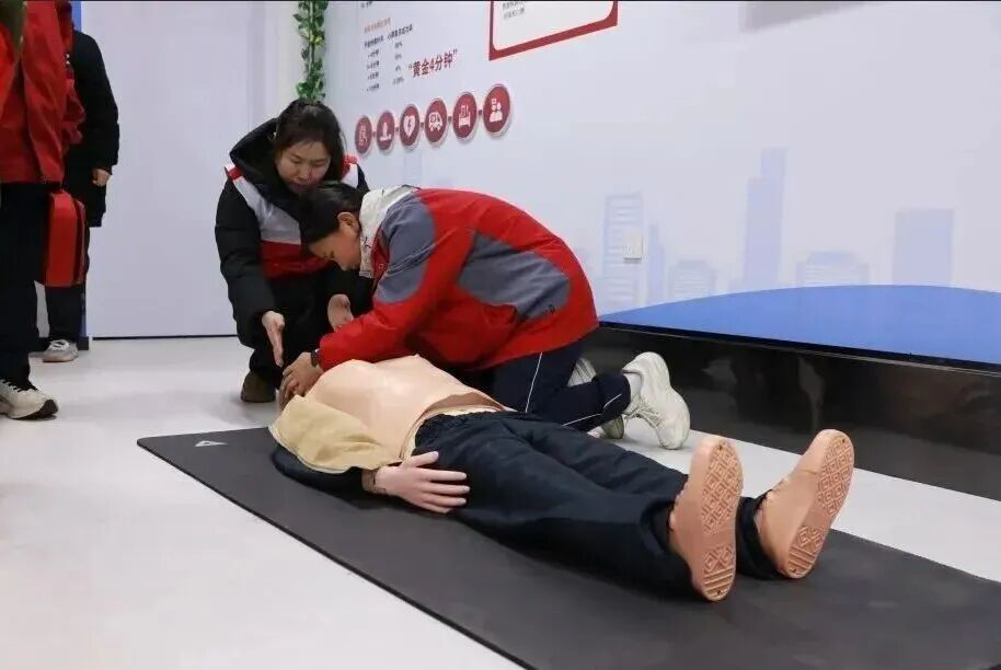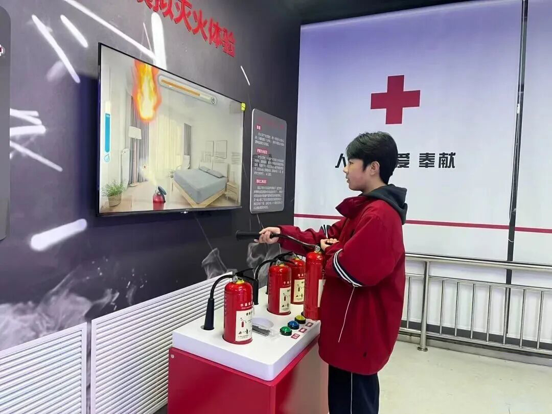 体验室里,红十字救护社团的学生正在进行心肺复苏、创伤包扎等应急救护实操训练。他们动作娴熟,操作规范,很快便完成了应急救护一整套操作流程。体验室配备了交通安全、消防安全体验设备等先进教学器材,沉浸式体验让实践教学变得更加直观易懂。